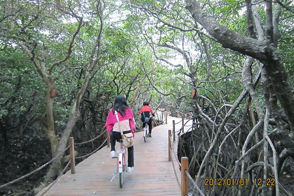 绿道是不允许机动车进入的,但可以在入口处的服务区租赁自行车,租赁费每小时20元。缴纳一定的押金后,女式车、山地车等各种款式和规格的自行车就任我们挑选了。当然,我和另外一位朋友在车尾箱带上的折叠自行车,同样可以免费直入。集体出游的游客或不方便骑行的游客也可租赁电瓶车。绿道宽有三米左右,根据地势或用红砖、水泥砖、彩砖或用木板铺设。沿途配备有规范的标识牌、安全警示标识、卫生等必要设施。在一些我们叫得出或叫不出名的树身上都挂有小牌,告诉我们这些花草树木的名称、所属科目、特点、作用等。据说,绿道沿线布置了一级服务点11个、二级服务点19个,满足游客骑行中途休息、补给、换乘需求。我们骑车前行,每隔一段路程就看到根据地理环境设置的驿站,驿站内供游客休息的椅子、小卖部、洗手间、农家乐等应有尽有。在少数地段通过架设木栈道选择穿越红树林生态保护区,使人能近距离接触红树林,但又能保护红树林。为保持视线通透,在水面较开阔或水景较好处还设置了一些亲水平台或亲水栈道,我们凭栏而望,古老茂密的红树林,满目葱翠,风光极好。红树林中的木质码头两侧停靠着渔船和游览船,游客可乘坐游览船到红树林“采风”,犹如穿越“时空隧道”。
