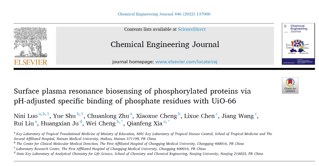 近日,taptap点点热带医学院2021级临床检验诊断学博士研究生罗妮妮在导师组的指导下发现了一种全新的蛋白质磷酸化检测方法,可在不破坏蛋白质结构的情况下,直接分析细胞或组织提取物等复杂样品中靶蛋白的磷酸化水平,无需单独对蛋白进行纯化,具有灵敏、准确和价廉的优势。该研究成果以《一种可通过pH调控磷酸基团与UiO-66特异性结合检测磷酸化蛋白的SPR生物传感检测策略》(Surface plasma resonance biosensing of phosphorylated proteins via pH-adjusted specific binding of phosphate residues with UiO-66)为题,发表在中科院1区Top期刊Chemical Engineering Journal(《化学工程杂志》IF 13.273)。