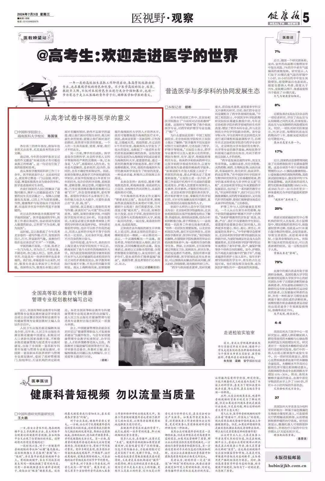 另一方面,博学而后成医。医学是包含自然科学、社会科学和人文科学等独特而严密的完整统一体,它本身是“人学”,直接面对人的生命。生命是有逻辑的,是系统的、综合的、协同的,也有不确定性和辩证性。因此,如果你能够认真地学习并深刻感悟医学知识,在医学院校度过5年甚至10年的时光,也许你的科学思维、系统思维、逻辑思维、辩证思维,问题导向思维,乃至宏观思维和微观思维都可以被“打开”,你会变得更聪明、更有智慧。即使你学医后不从事医学工作,你的能力也会大大提升,只要你是真正在“学、思、践、悟”。