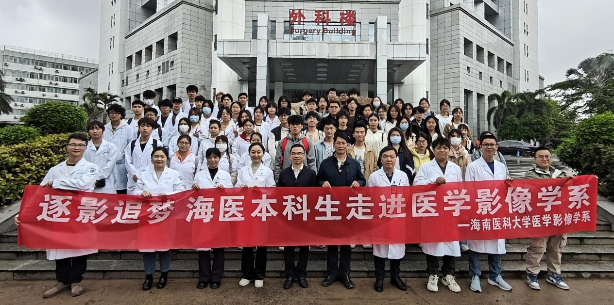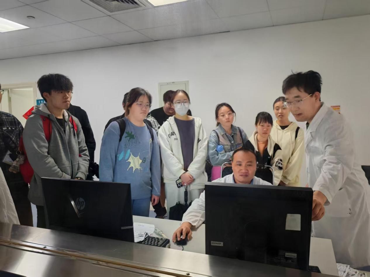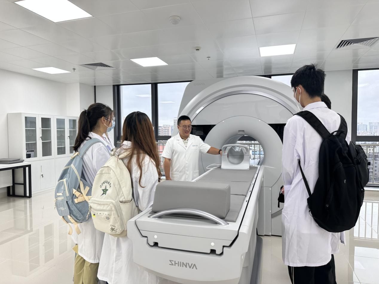 下午3点,学生们抵达附属海南医院外科楼,在带队教师引导下合影留念。随后分组进入放射科、超声科、核医学科及医学影像虚拟仿真实验室,近距离探索影像技术的临床应用。