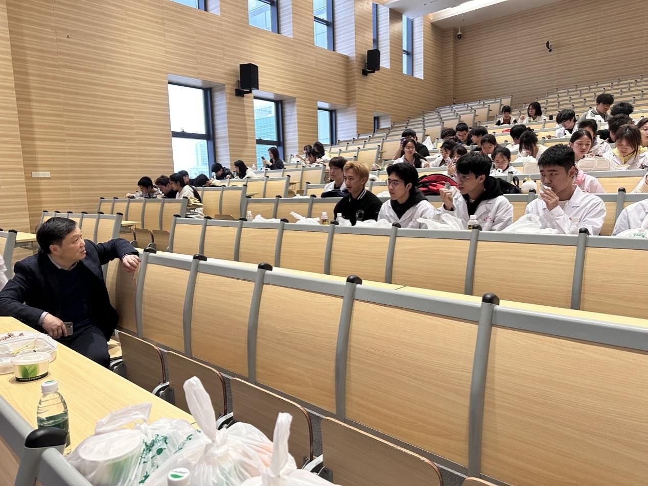 师生们齐聚教学楼2楼会议室。临床医学院副院长张秀峰讲解医学影像技术专业发展前景,并鼓励学生们保持热爱、加强学习。