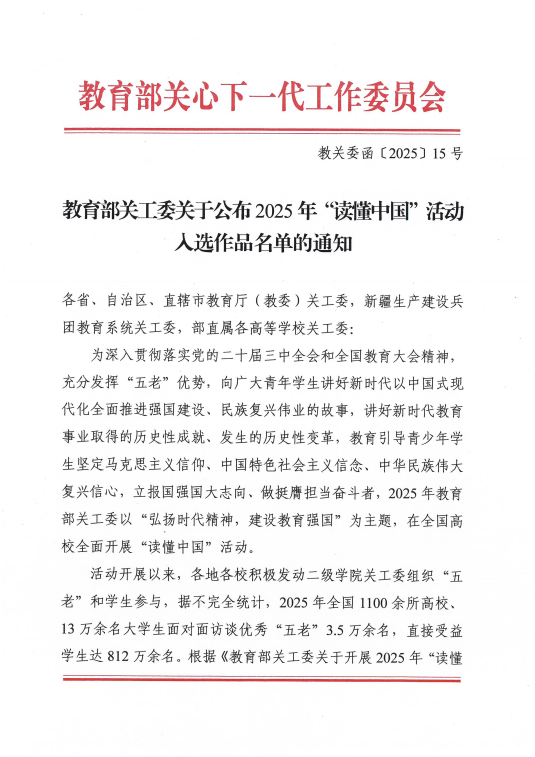 作为学校“三全育人”格局的重要组成部分,学校关工委持续创新育人载体,此前已多次在“读懂中国”活动中斩获佳绩。此次入选表扬单位,既是对过往工作的肯定,更是对未来的激励。学校关工委将继续发挥“五老”育人优势,推动红色基因与医学精神深度融合,认真落实教育部和省教育厅关工委关于深化“读懂中国”活动成果的号召,为培养医德高尚的新时代医学人才注入持久动力。