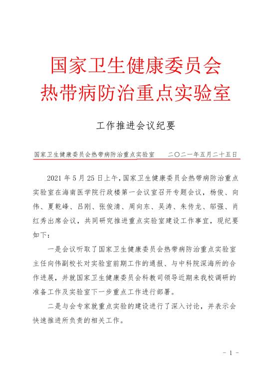 国家卫生健康委员会热带病防治重点实验室工作推进会议 2021.05.25