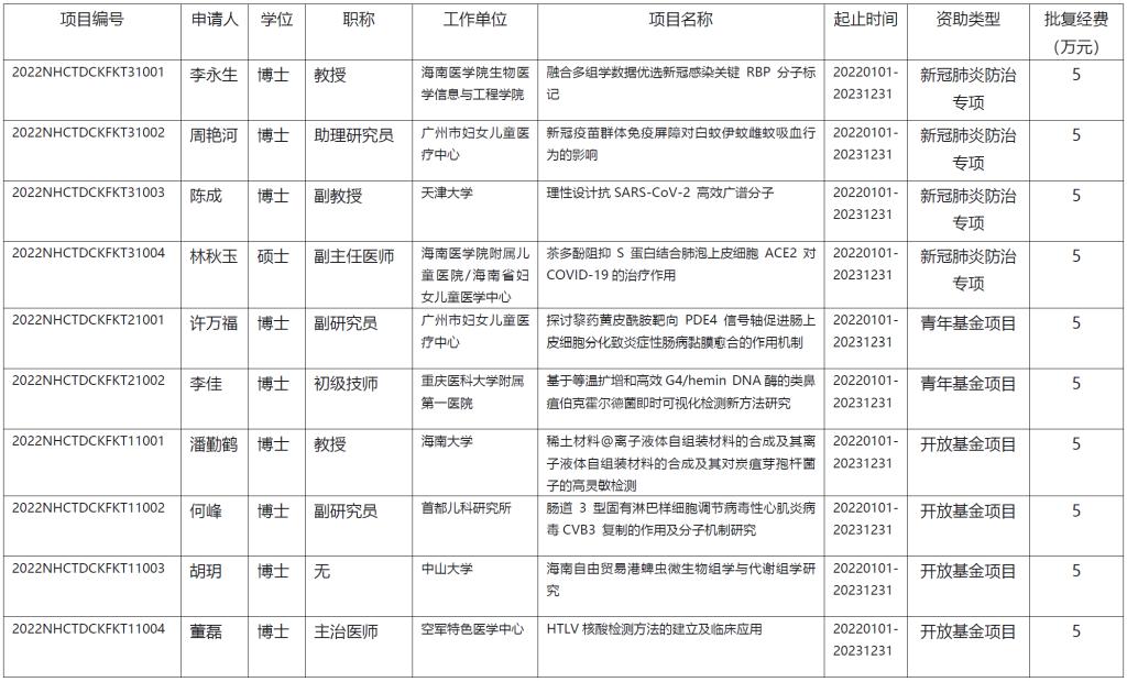 根据《海南医学院国家卫生健康委员会热带病防治重点实验室开放课题管理办法》和《2022年度海南医学院国家卫生健康委员会热带病防治重点实验室开放课题申报指南》的要求,海南医学院国家卫生健康委员会热带病防治重点实验室2022年度开放课题评审工作已结束,感谢所有申请人对本实验室开放课题的关注。经专家审议,确定对以下10项开放课题予以立项资助,资助类型包括新冠肺炎防治专项,小计4项;青年基金项目,小计2项;开放基金项目,小计4项。资助金额为5 万元/项,合计资助金额50万元。