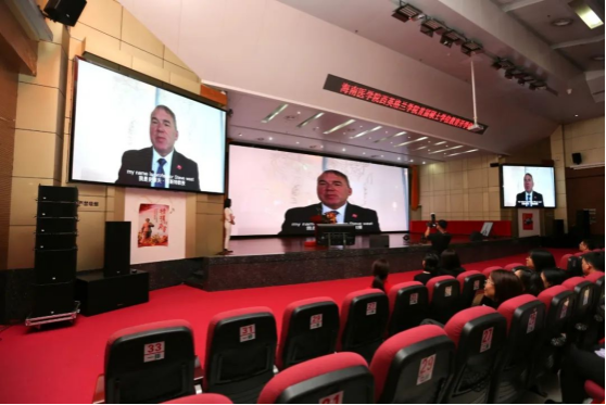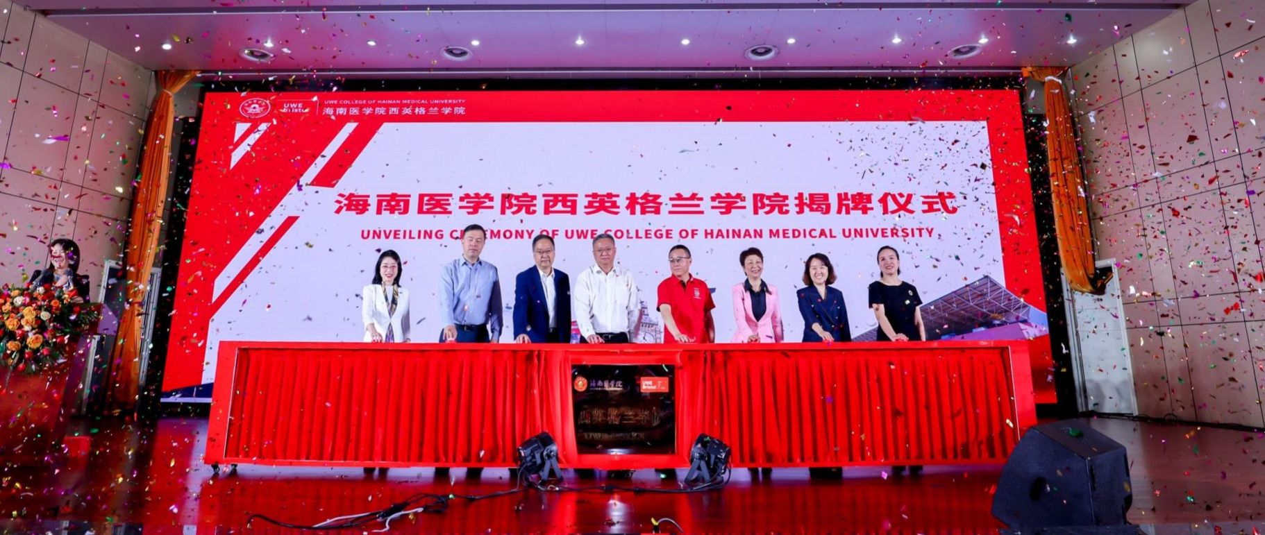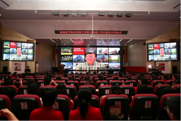 3月27日上午,海南医学院西英格兰学院首届硕士学位教育开学仪式暨学院揭牌仪式在国际报告厅隆重举行。学校党委书记杨俊,英国西英格兰大学中国区总经理Mr.Frank Yan,学校党委副书记张巍,副校长兼西英格兰学院院长张彩虹,副校长杨伟国,副校长李现红,党委委员、组织部长谢毅强,党委委员、宣传(统战)部长雷浩泽,学校党政职能部门及二级单位的主要负责人,公共卫生、康复治疗、国际护理实践、医学影像技术4个专业的教师代表,以及西英格兰学院全体研究生新生参加仪式。仪式由对外交流与合作处处长、西英格兰学院党委书记李果果主持。