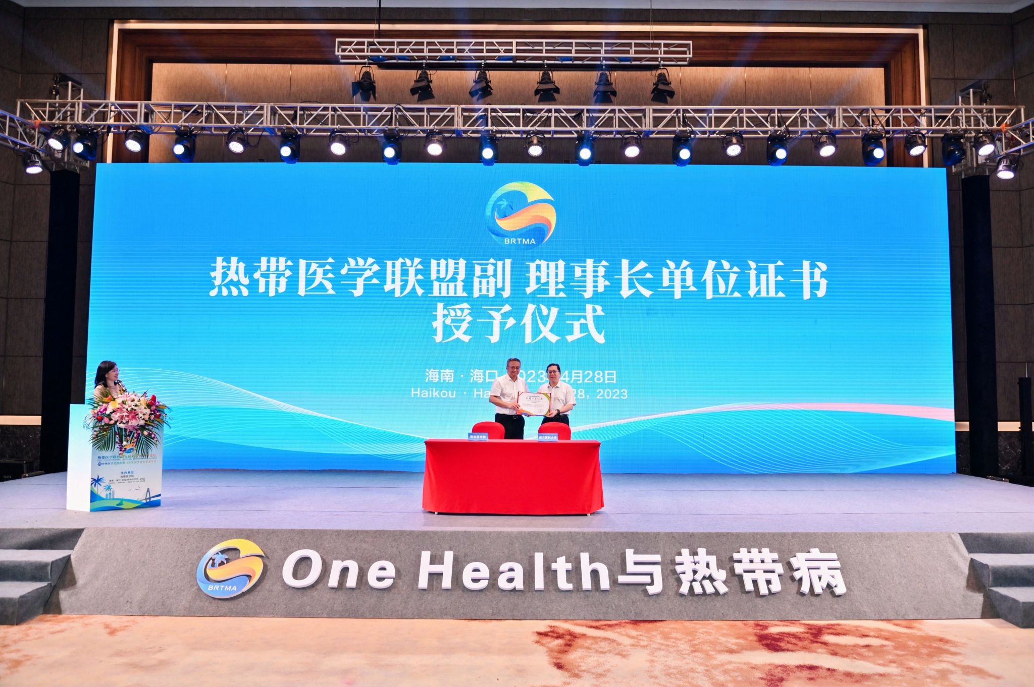 热带医学联盟理事长杨俊,为南方医科大学颁发副理事长单位证书。