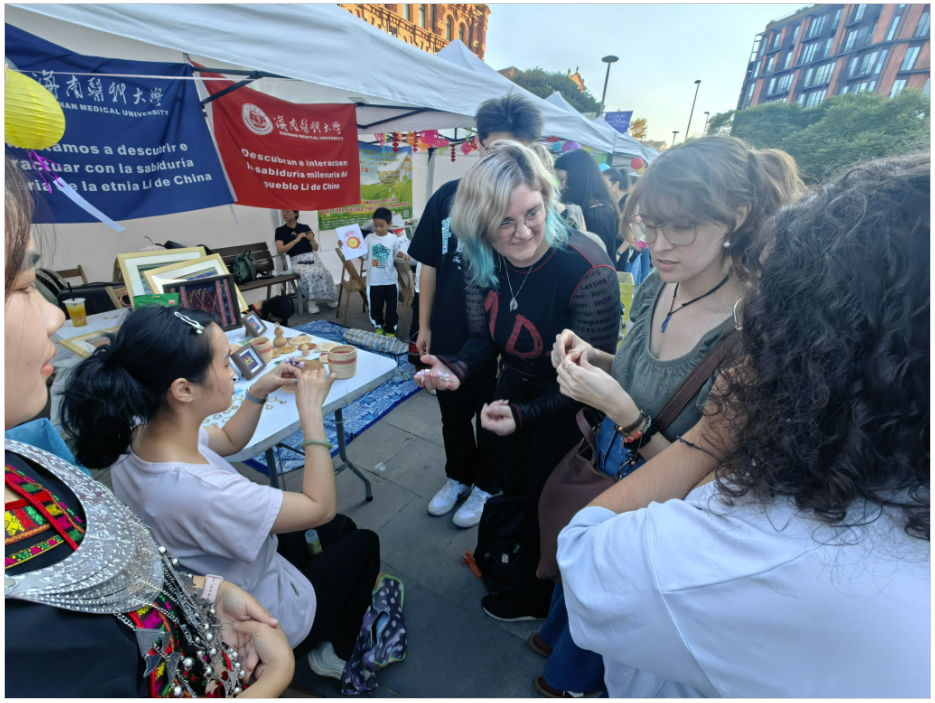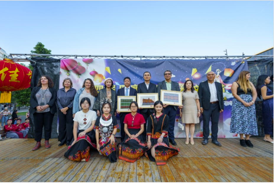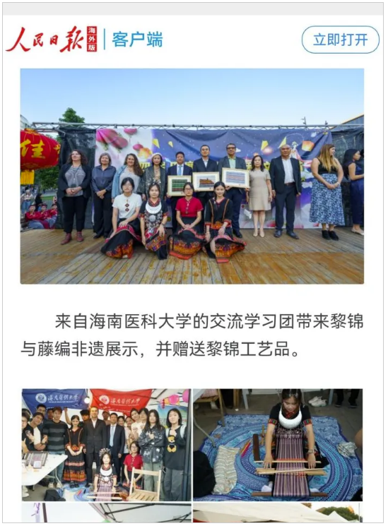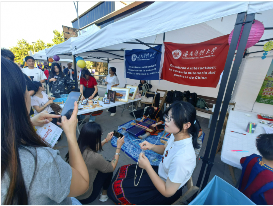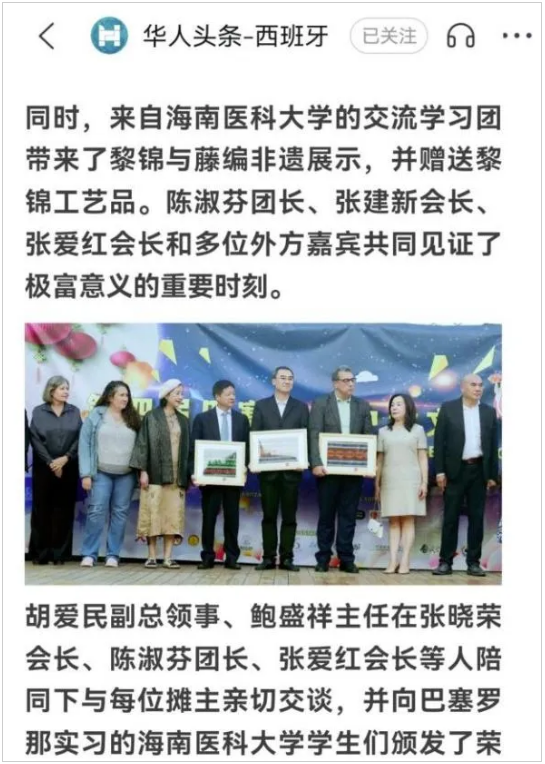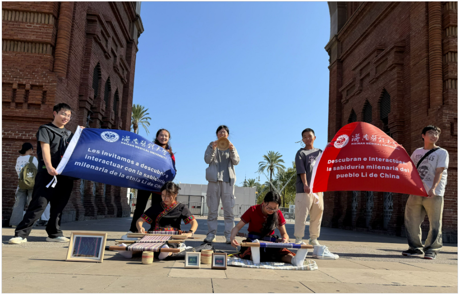研学团还积极参加了由中国驻巴塞罗那总领馆与巴塞罗那市政府共同支持的“第四届巴塞罗那中秋文化节”。开幕式上,同学们代表学校向中国驻巴塞罗那总领馆副总领事胡爱民、巴塞罗那市政府文化事务专员佩德罗·阿吉列拉先生及主办方赠送了亲手织造的海南黎锦。这份蕴含海南民族智慧与深情厚谊的礼物,赢得了各方的高度赞誉。