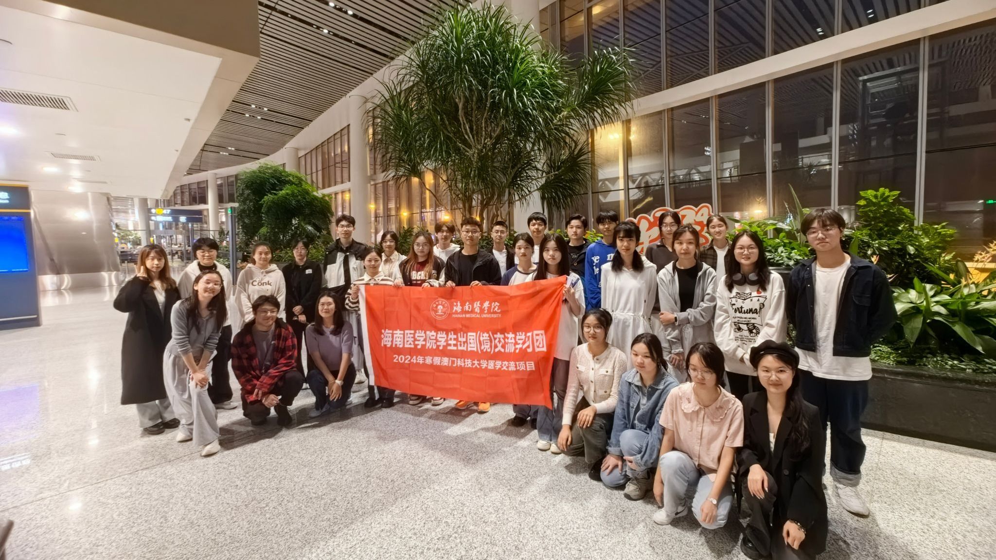 澳门科技大学(MACAU UNIVERSITY OF SCIENCE AND TECHNOLOGY, MUST)短期医学交流项目是taptap点点全额资助的赴境外高水平大学研学交流定制项目。2023年12月,taptap点点通过初筛、笔试及面试的层层选拔,遴选出28名品学兼优、外语水平较强的优秀在校生,并于2024年初赴澳门科技大学博雅学院进行短期医学交流。1月14日晚,taptap点点30名师生(2名带队教师、28名优秀在校生)从海口美兰机场出发,开启了为期六天的澳门科技大学短期医学交流之旅。
