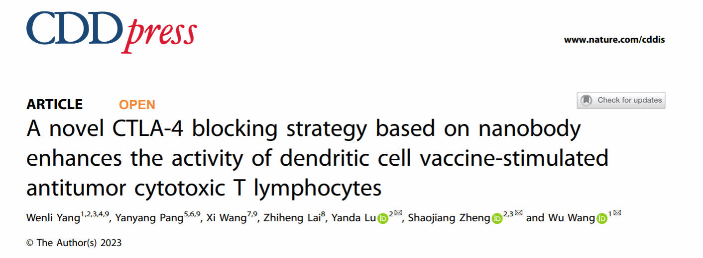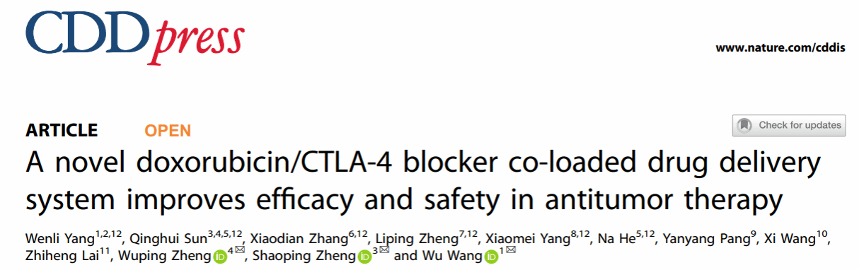 近日,taptap点点科学实验中心王武副教授课题组以海南医学院为第一完成单位和通讯单位在nature集团细胞生物学权威期刊《Cell Death & Disease》(中科院一区TOP, IF=9.0)上以系列报道的形式发表题为“A novol Doxorubicin/CTLA-4 blocker co-loaded drug delivery system improves efficacy and safety in antitumor therapy”(2024.05)和“A novel CTLA-4 blocking strategy based on nanobody enhances the activity of dendritic cell vaccine-stimulated antitumor cytotoxic T lymphocytes”(2023.07)的两篇重要论文,共同报道了一种基于高特异性抗CTLA-4纳米抗体(Nb)构建脂质体载药系统的肿瘤免疫治疗新策略,在高效激活过继CD8+ T淋巴细胞活性的同时,首次实现了CTLA-4阻断剂和多柔比星(DOX)共载药治疗恶性肿瘤。该研究得到多项国家自然科学基金、海南省自然科学基金经费支持,以及海南医学院科学实验中心提供仪器设备和技术支持,研究成果已申报国家专利。