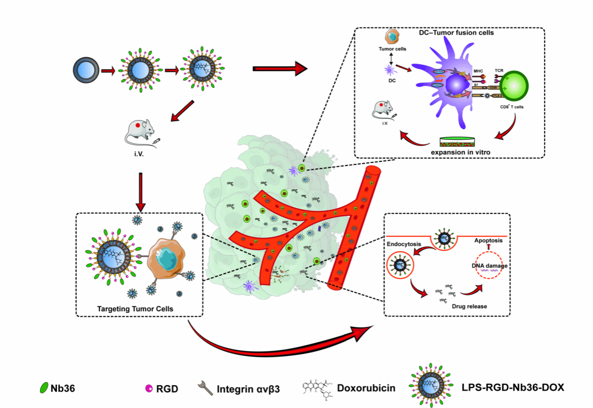 本研究在LPS-Nb36的基础上,利用脂质体独特的双分子层结构,构建CTLA-4 Nb和多柔比星双载药系统(LPS-RGD-Nb36-DOX),能将DOX更高效运输到肿瘤局部,同时激活肿瘤局部的T细胞。研究结果表明该疗法形成的肿瘤特异性T细胞可在体外/体内高效杀伤肿瘤靶细胞,具有更强的增殖和细胞因子分泌能力,同时结合了免疫细胞过继治疗可显著降低DOX用量,减少化疗药物的毒副作用,具有更好的临床应用安全性(2024, Cell Death & Disease)。本成果的发布提示当前的肿瘤载药治疗可以在载体结构优化、靶向探针选择方面取得突破,多疗法结合可能是未来的主要研究方向。