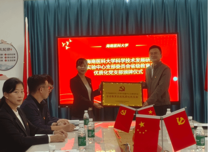张鹏副部长为科发院科中党支部颁发海南省教育系统优质化党支部牌匾