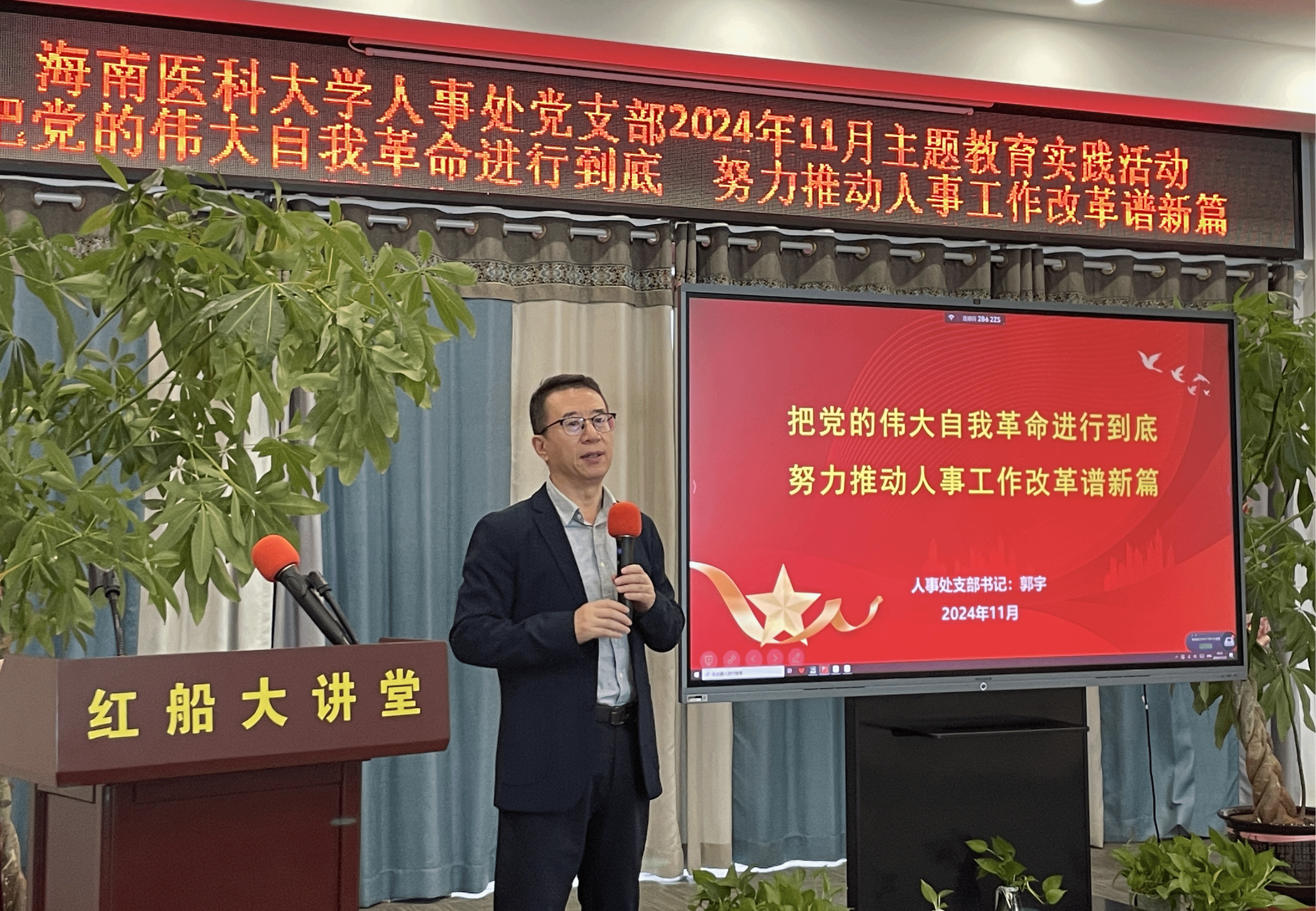 人事处支部书记、处长郭宇以“把党的伟大自我革命进行到底,努力推动人事工作改革谱新篇”为题,为支部党员讲授党课。他以2024年《求是》杂志刊登的习近平总书记的重要文章《时刻保持解决大党独有难题的清醒和坚定,把党的伟大自我革命进行到底》为切入点,阐述了解决大党独有难题必然是一个长期而艰巨的过程,在此过程中解决好六大难题是关键,即如何始终不忘初心、牢记使命,始终统一思想、统一意志、统一行动,始终具备强大的执政能力和领导水平,始终保持干事创业精神状态,始终能够及时发现和解决自身存在的问题,始终保持风清气正的政治生态,这是实现新时代新征程党的使命任务必须迈过的一道坎,是全面从严治党适应新形势新要求必须啃下的硬骨头。这就决定了全面从严治党永远在路上,党的自我革命永远在路上。基于上述认识,支部书记结合学校高质量发展目标和人事工作开展的一系列改革实践,就如何将伟大的建党精神和党的伟大自我革命进行到底落实到实际工作中分享了自己的观点,指出人事部门始终坚持“一心两导”策略,“一心”即学校党委确定的推动学校高质量发展的工作重心,“两导”即坚持《海南省人民政府关于支持海南医学院深化改革高质量发展若干措施》文件中目标引导和国强校长对人事改革工作的具体指导。具体到工作落实中就是要抓好人才和师资队伍建设,深化职称制度改革,发挥绩效改革“杠杆”作用,开展人事管理信息化建设,科学把握教师师德失范行为处理原则,一系列改革措施融会贯通,真正把贯彻落实党的伟大自我革命同人事工作改革结合起来,真正把学习贯彻党的二十届三中全会精神的具体成效转化为工作实效。