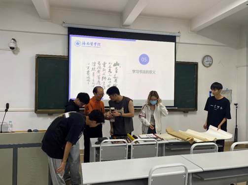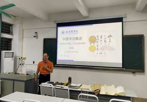 2023年10月15日晚,学校公共选修课《书法课》在海南医学院崇学楼(第一教学楼)1-106教室正式开课。来自全校各专业21、22级近80名学生选修学习。本学期《书法课》由海南医学院马克思主义学院(人文社会科学部)党总支王身坚书记领衔主讲,海南医学院马克思主义学院(人文社会科学部)徐海波老师参与辅助教学。