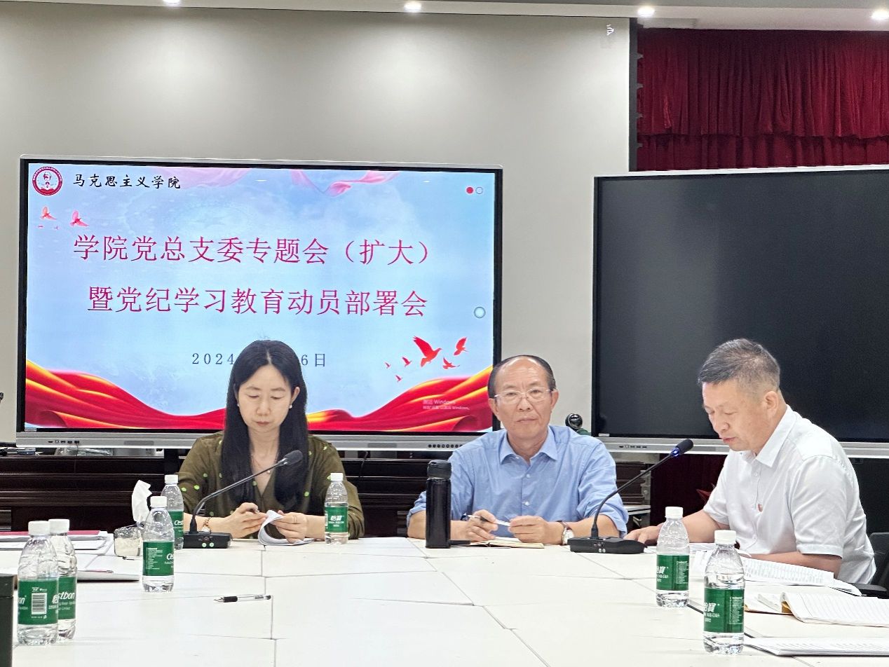 4月16日下午,马克思主义学院党总支在学院学术活动中心召开学院党总支委员会议(扩大),深入学习贯彻习近平总书记关于党纪学习教育的重要讲话和重要指示精神,传达学习中央党的建设工作领导小组会议精神,贯彻落实中共中央办公厅《关于在全党开展党纪学习教育的通知》要求,安排马克思主义学院(人文社会科学部)党纪学习教育工作。会议由党总支书记王身坚主持,学院党总支全体党员参加了会议。