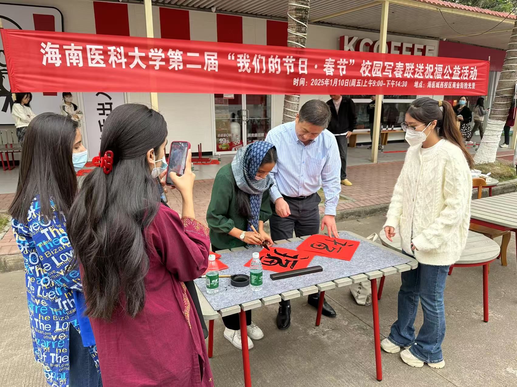10日一大早,马克思主义学院(人文社会科学部)工会就投入紧张的现场准备工作。在商业街拉起了大红的横幅,布置好四张书写台,并把笔墨纸砚等一应用品摆放到位,把节日氛围拉满。