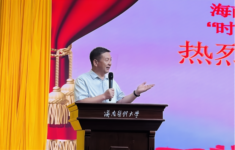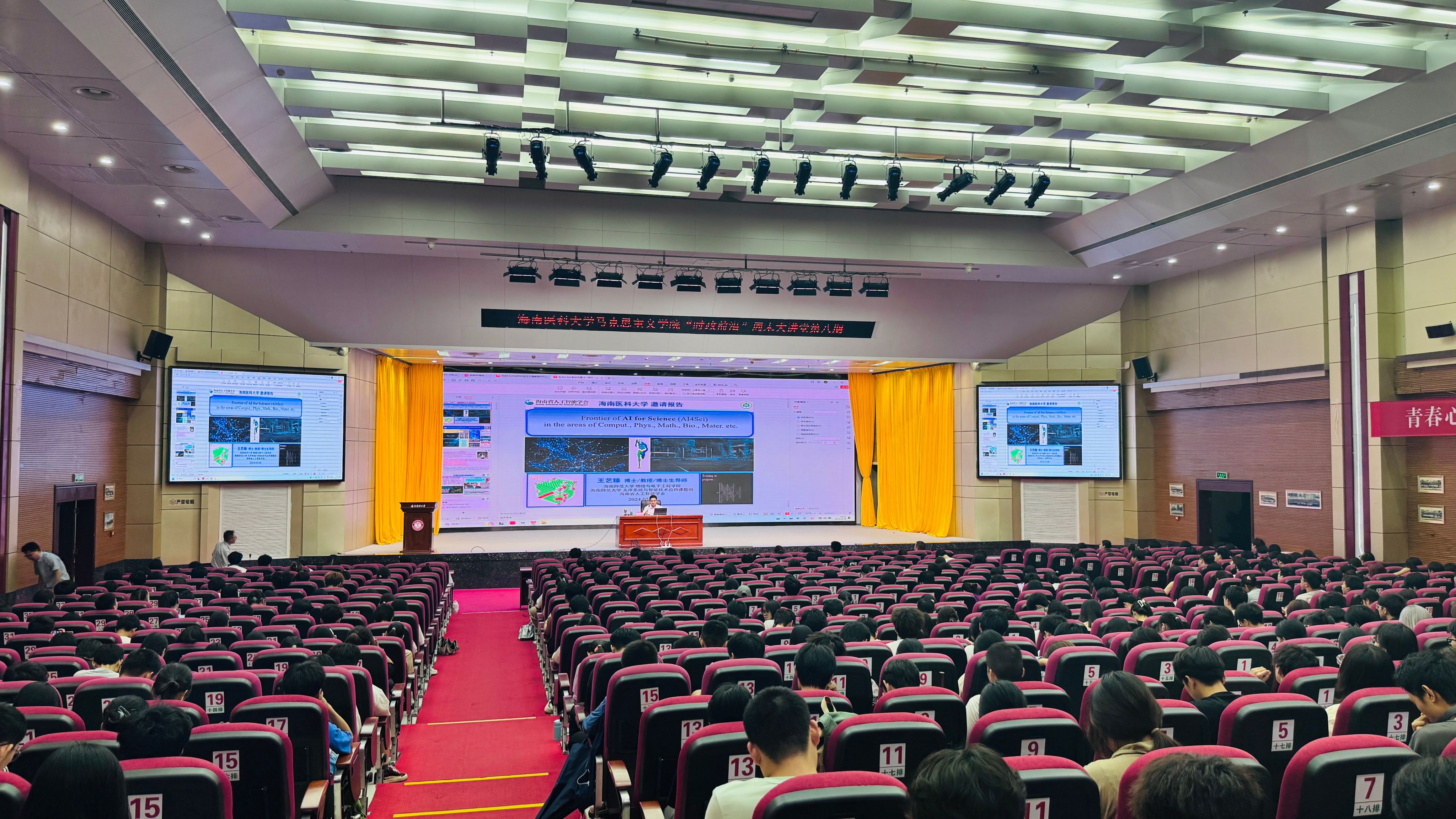 2025年5月25日晚,马克思主义学院(人文社会科学部)“时政前沿”周末大讲堂第八期在学校立德厅(国际报告厅)成功举办。为了帮助大学生了解人工智能的发展及其影响,提升大学生的人工智能素养,本期讲座特邀海南师范大学物理与电子工程学院副院长、海南省人工智能学会理事长、博士生导师王艺臻教授担任主讲嘉宾,以“Frontier of AI for Science”为题开讲。马克思主义学院(人文社会科学部)党总支副书记黎同柏主持讲座,形势与政策教研室教师徐海波、马朝林、刘欢及近600名师生共同参与。