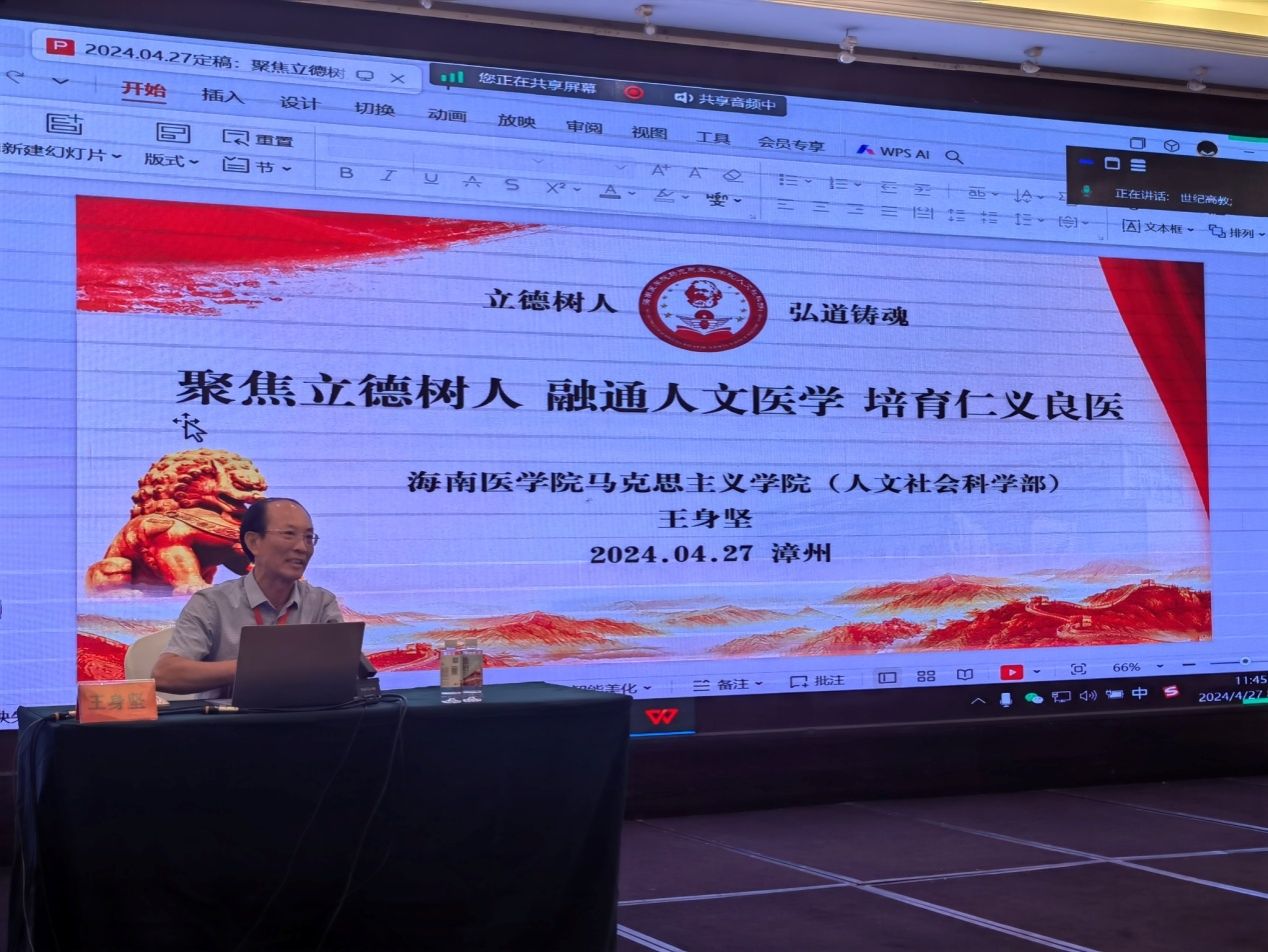 我院党总支书记王身坚应邀参加会议,并在会上作了题为《聚焦立德树人 融通人文医学 培育仁义良医》的发言,分享了taptap点点马院思政课建设理念和实践案例。同时,王身坚书记诚挚欢迎与会优秀青年才俊和更多高层次人才加盟海南医学院马院,共同努力、共同成长、共同发展,为海南自贸港建设、海南医学院的高质量发展添砖加瓦。