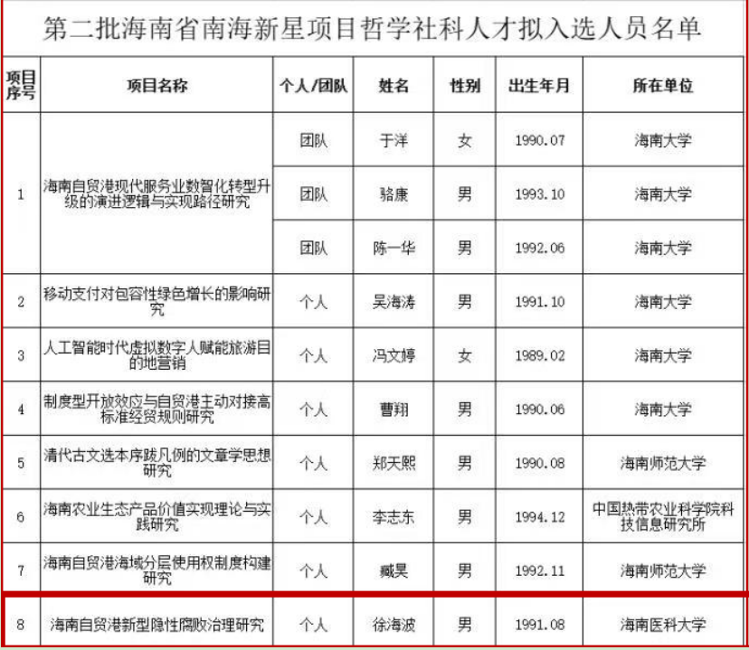 喜报二:徐海波博士荣获第二批海南省南海新星项目哲学社科人才称号