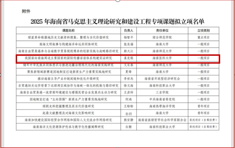姜克银教授《我国面向南海周边主要国家的国际传播话语体系构建实证研究》,成功中标2025年海南省马克思主义理论研究和建设工程专项课题。该课题项目旨在推动马克思主义理论在区域的深化研究与创新实践,本次全省仅有14个单位/个人获立项支持,竞争激烈、遴选严格。姜克银教授所申报的课题聚焦中国特色社会主义在海南自贸港建设背景下的理论探索与实践路径,研究不仅有助于丰富和发展马克思主义中国化时代化的理论内涵,更能够为海南省推进国家战略建言献策,提供重要的学理支撑和决策参考。此次中标彰显出我院在马克思主义理论研究方面已初步形成特色方向与学术影响力,对提升学院在省内社科领域的地位、强化学科话语权具有里程碑意义。