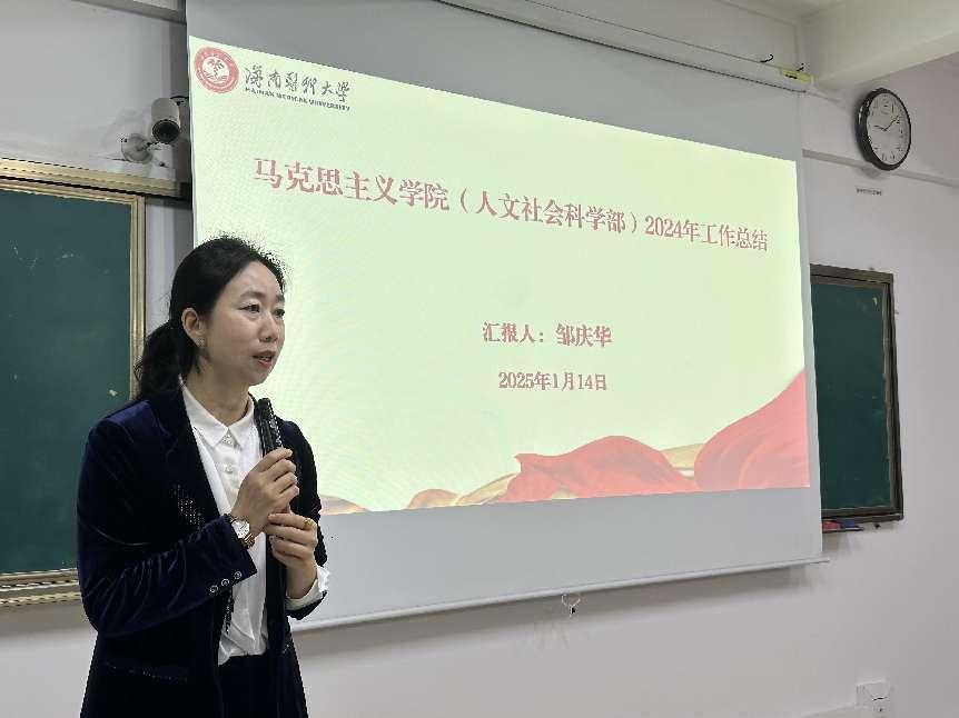 会议伊始,华副院长首先向全体教职员工一年来的辛勤付出和取得的显著成绩表达了衷心的感谢,并紧扣学院2024年目标责任任务简要回顾了一年来学院在党的建设、教育教学、科学研究学科建设、师资队伍建、社会服务等方面取得的主要成就及亮点。特别值得一提的是,过去一年学院全体教师齐心㔹力,迎难而上,取得了诸多重要成绩,其中最为关键的是成功获批海南省示范马克思主义学院培育单位称号,这不仅是对学院历年工作的肯定,更为未来的发展奠定了坚实基础。号召大家继续团结一心,共创马院新辉煌。