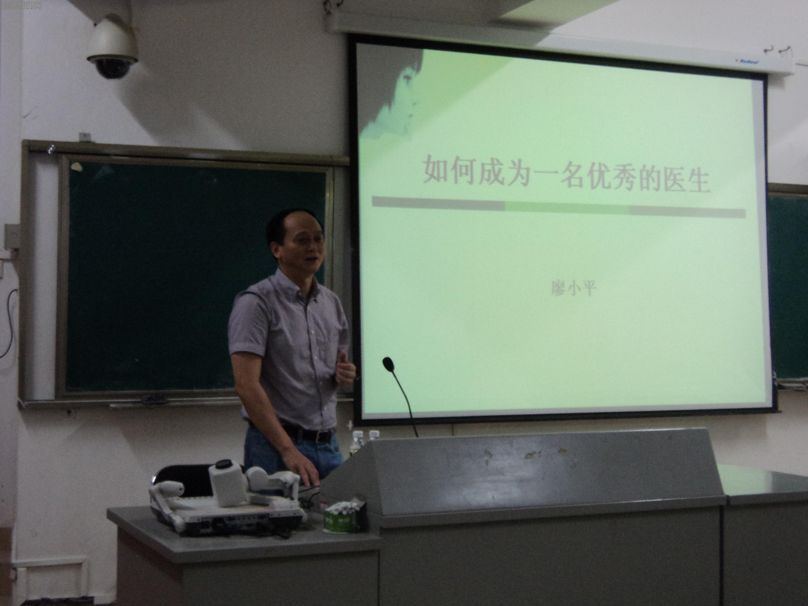 2012年11月21日晚,廖小平书记在第一教学楼103教室为我院2010级临床医学本科(3)、(4)班同学就“如何成为一名优秀的医生”做精彩讲座。出席本次讲座的嘉宾有人文社科部吴江生主任、黄妹主任、苏玉菊老师、王天秀老师等及临床学院辅导员。