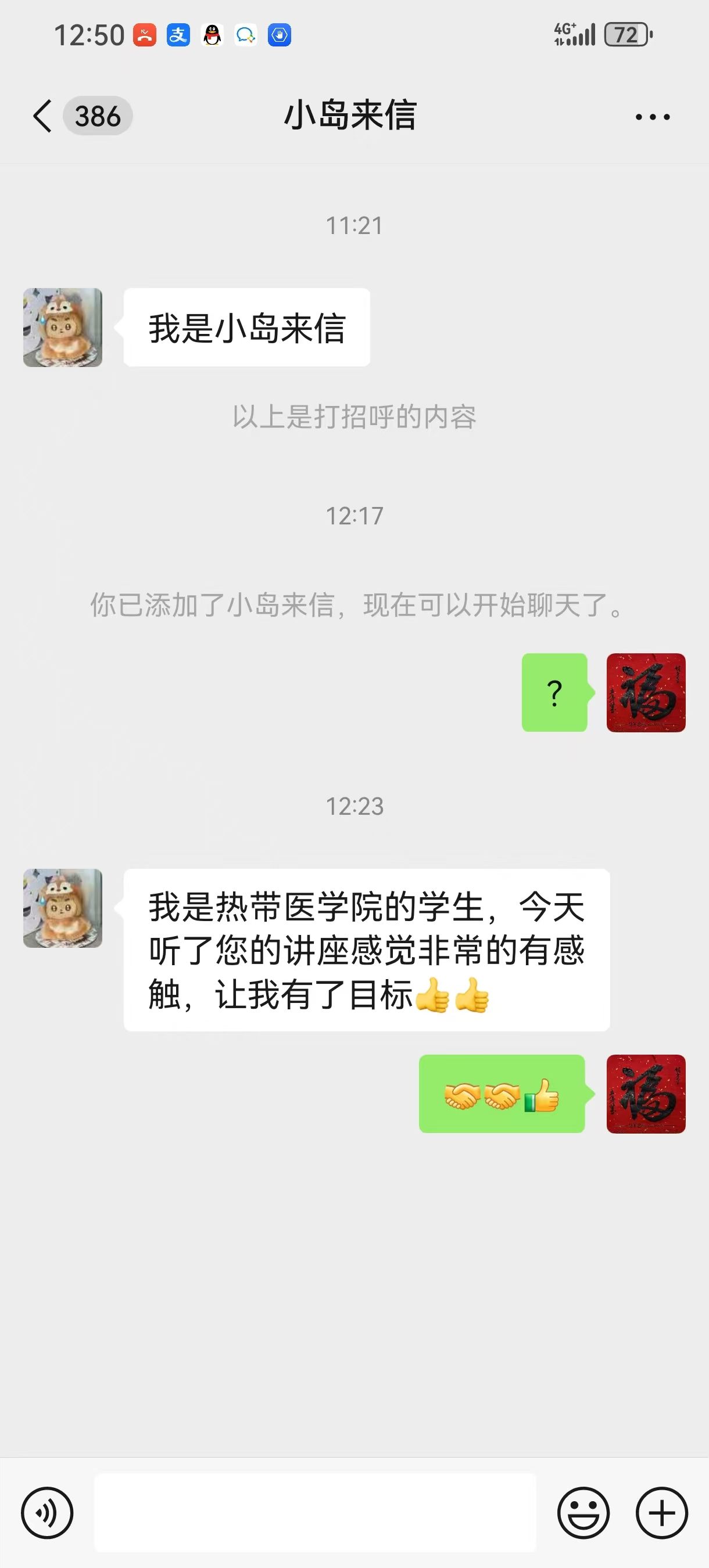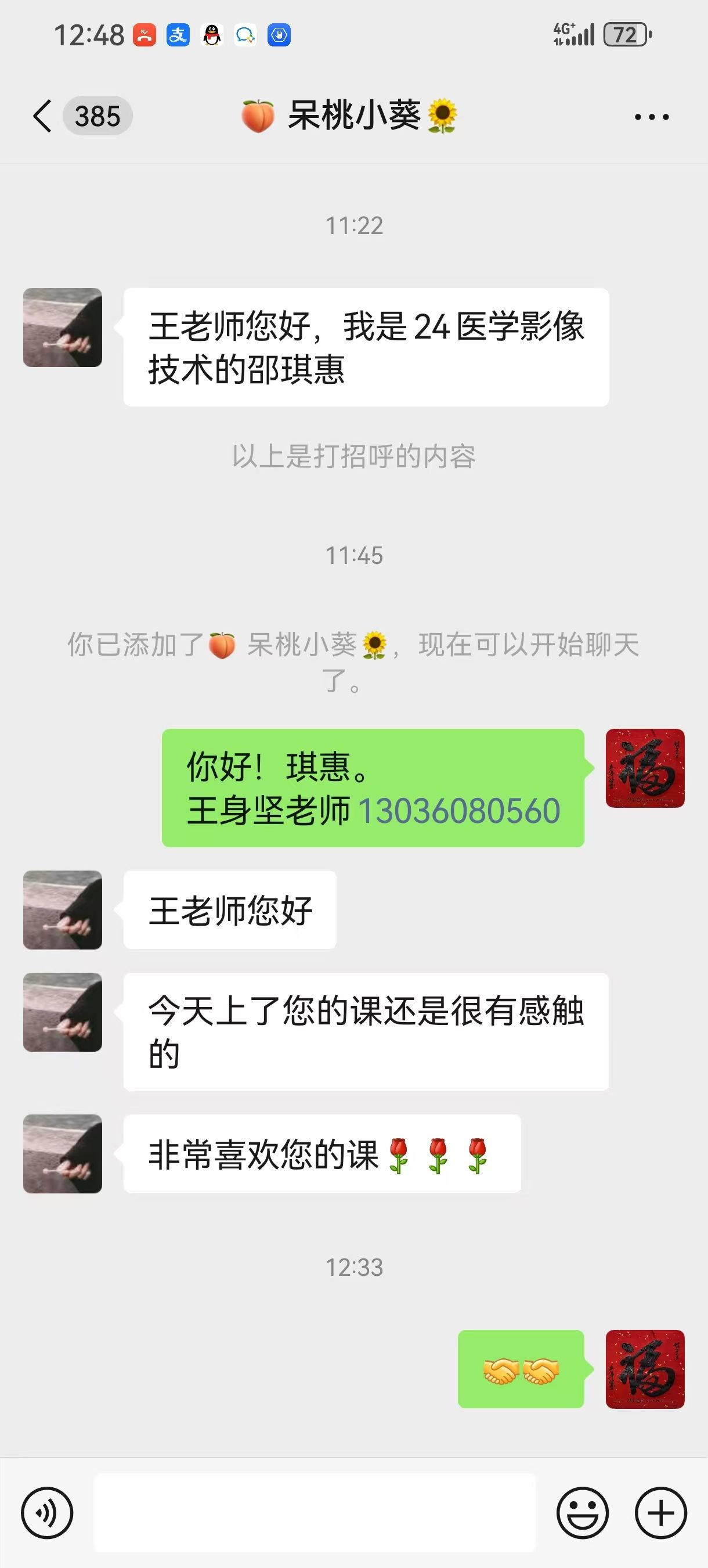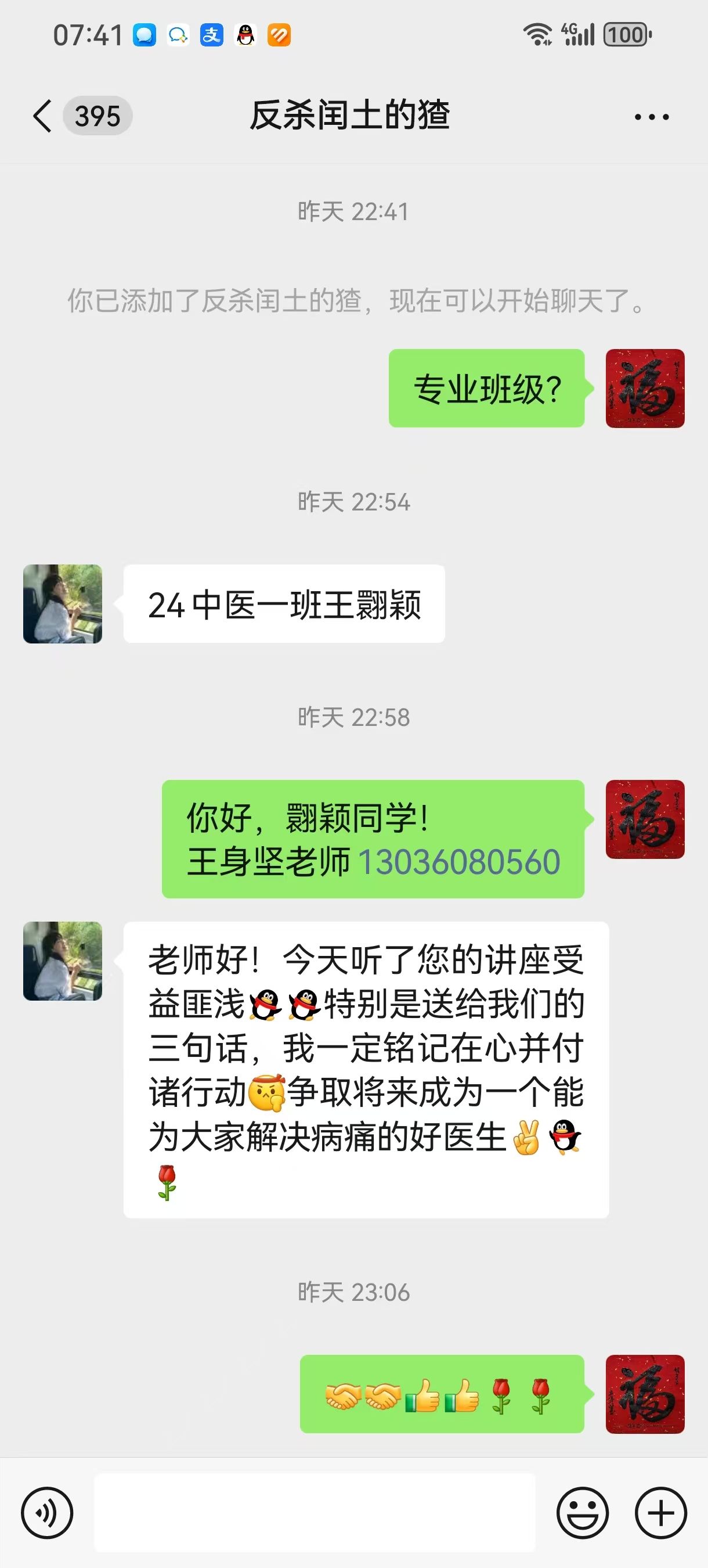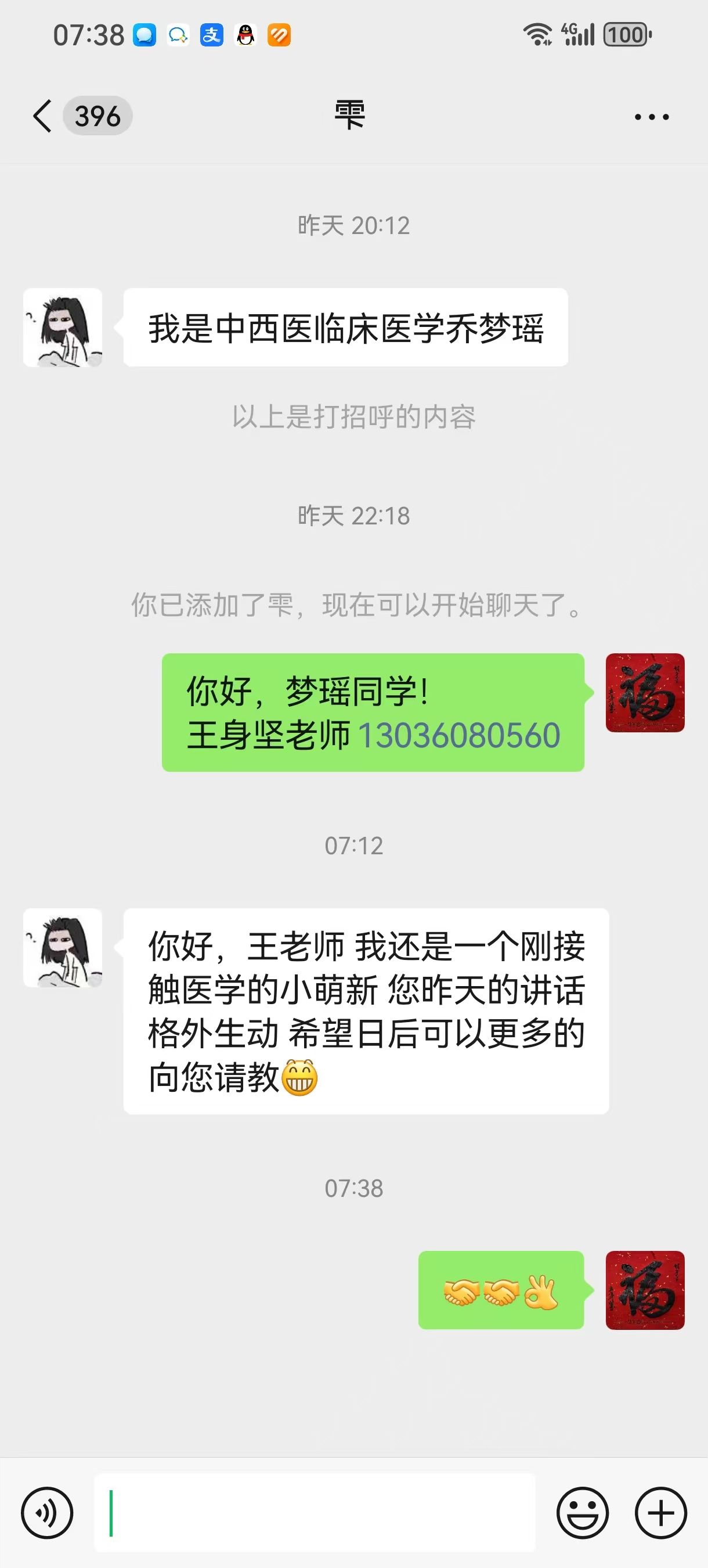 “王老师,我还是一个刚接触医学的小萌新,您昨天的讲话格外生动,希望日后可以更多地向您请教。”