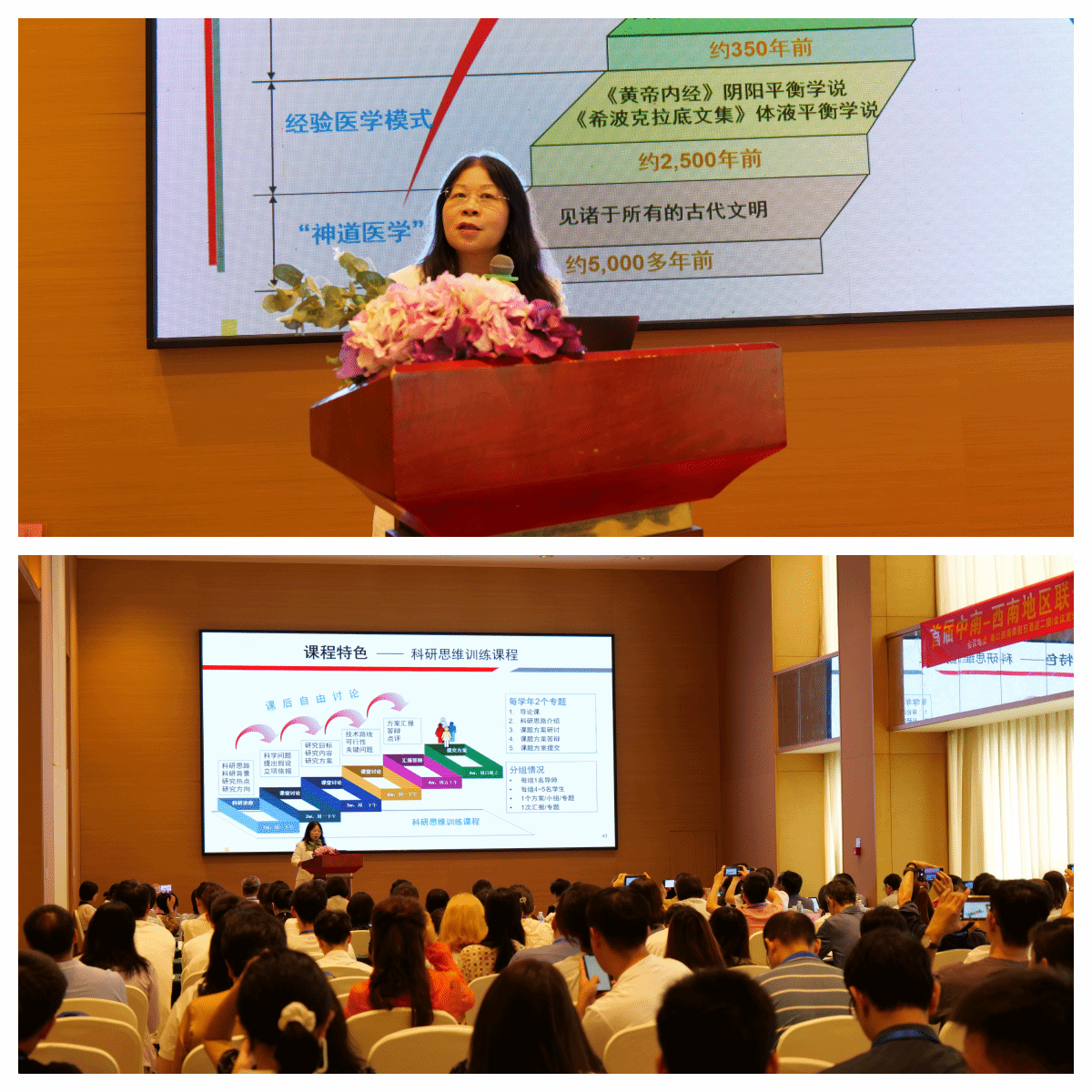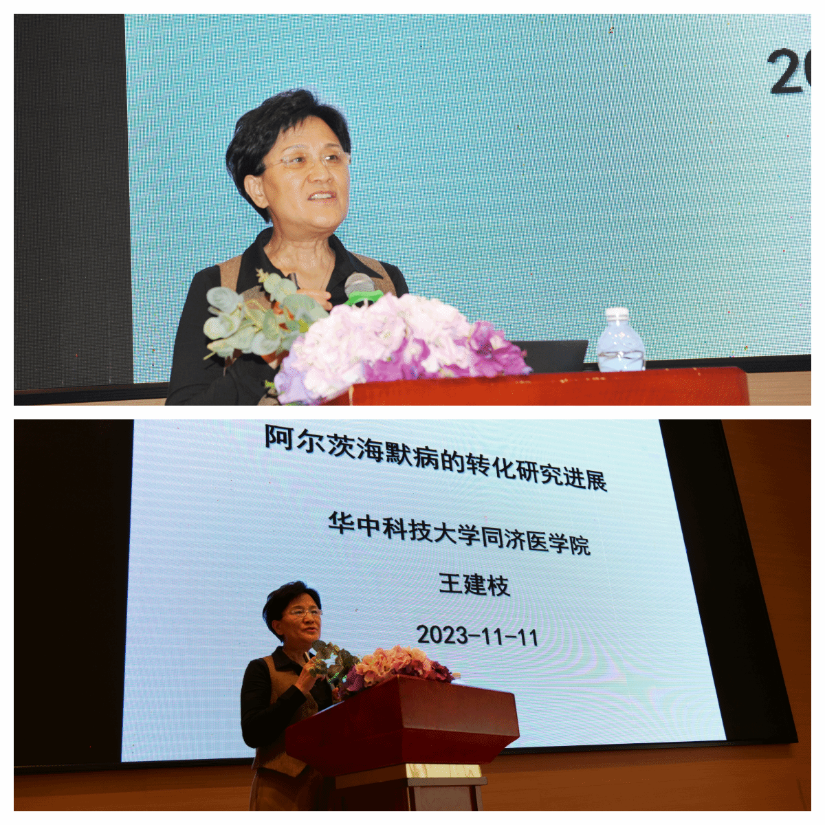 2. 华中科技大学王建枝教授,她是中国病理生理学会副理事长、国际病理生理学会副主任委员、教育部第6 届科技委生物与医学学部委员、教育部神经系统重大疾病重点实验室主任、教育部长江学者特聘教授、国家杰出青年基金获得者、国家万人计划领军人才、国家教学名师、国家级规划教材《病理生理学》及《Pathophysiology》主编。王教授给代表作了题为《阿尔茨海默病转化研究进展》的专题报告,她分享了三十多年的科研成果,以阿尔茨海默病发病机制及临床转化研究为例,给代表们讲解了选题和创新的科研思路及卓越的研究成果,展示了一场经典的科研学术报告。