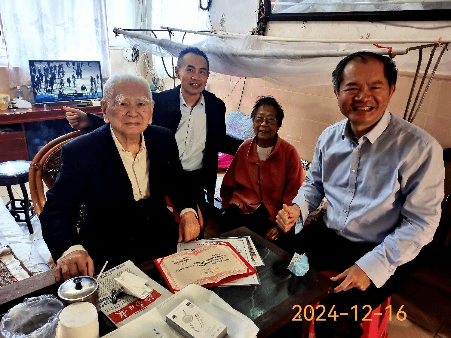陈世民和马春阳将海南省生理科学学会终身贡献奖证书送到邓子夫教授手中