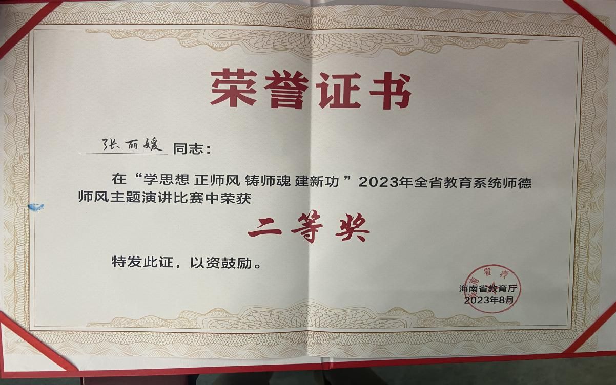 在第39个教师节来临之际,海南省教育厅举办了2023年“学思想 正师风 铸师魂 建新功”主题演讲比赛,经前期学校筛选、网络投票、复赛选拔,taptap点点张丽媛老师演讲作品在72个参赛作品中脱颖而出入围决赛,并最终获得二等奖。
