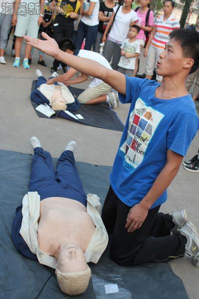 在这次活动中,校学生会医学实践部的同学们为现场师生演示了呼吸心跳骤停下的心肺复苏术,对躺地的突发病员进行心肺复苏,现场模拟了呼喊、拍打、触脉搏、胸外按压、解开放气道、人工呼吸等抢救环节。还进行了包扎止血等自救互救方法演示。随后,校红十字会的志愿者向现场师生发放了救护宣传资料,并组织围观学生进行模拟操作,现场气氛活跃。