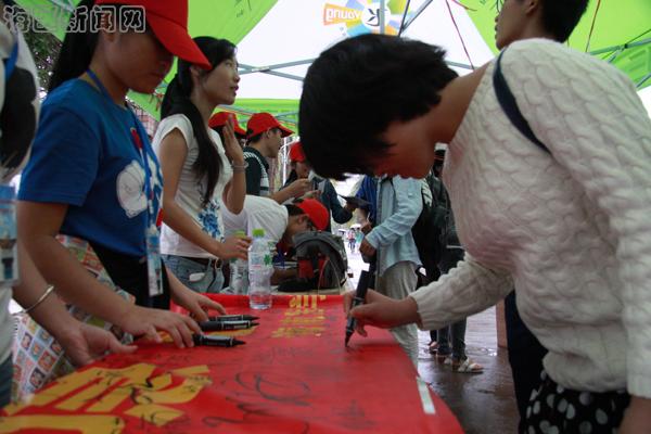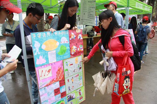 本次活动的口号有“找火灾隐患,保校园安全”、“防范胜于救灾”;活动共有三个环节:第一环节,有奖竞答,在志愿者的热情介绍和引领下,参与人员通过撕下粘贴的问题并解答,然后拿到志愿者处核对答案,回答正确者被赠送小礼品;第二环节,宣传报投票,参与人员观看青年志愿者协会制作的消防知识小宣传报并进行投票;第三环节,消防签名,同学们接过志愿者传递的画笔在“找火灾隐患,保校园安全”横幅上签上了自己的名字。