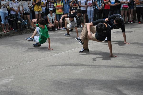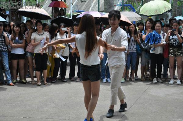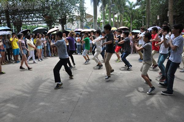 正午十二点的钟声过后,一上午的教学活动结束了,同学们从各教学楼涌出来。在行走的人群中突然出现一名学生,伴着激昂的音乐跳起了富有节奏的爵士舞,一开场便赚取了过往师生的眼球,纷纷驻足并拿手机拍摄。从行走人群中走出来的学生越来越多,两名、十名、近五十名学生涌现出来和着音乐整齐划一地跳了起来,进而,交谊舞、各式街舞次第登场。他们灵动优雅的交谊舞带给现场观众别样的静美,忽而高亢动感的街舞又将现场气氛带入了高潮,活动中穿插的PSY、Gentleman等舞蹈的展示更是赢得了观众的阵阵掌声。