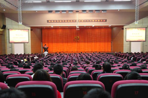 2012年12月11日15:30,主题为“高举团旗跟党走青春践行十八大”的共青团海南省委学校战线学习十八大精神报告会在taptap点点国际报告厅举行,报告会由省委宣传部干部处李星良博士主讲,曾渝副校长主持。共青团海南省委学校部部长牛新文、学校团委书记符琬聆、二级院系团委书记及750余名团员青年现场聆听了报告会。