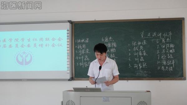 2013年7月7日上午10:00,海南医学院学生社团联合会第四届委员会委员增补会议在4-201顺利召开。学生社团联合会指导老师林仕芬、学生社团联合会主席团、各部长及各部门成员出席此次会议。学生社团联合会副主席贺莉担任本次会议的主持人。