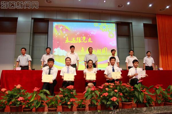 大会在雄壮的国歌声中拉开帷幕。会上,在全场600余名“老团员”的陪同宣誓下,137名新团员面对鲜艳的团旗许下了庄严的承诺;校团委组织部长王鹏宣读表彰决定之后,伴随着昂扬的共青团团歌声,第十二届“挑战杯”全国大学生课外学术科技作品竞赛优秀组织奖、第十二届“挑战杯”全国大学生课外学术科技作品竞赛终审决赛三等奖、海南省“五四”青年奖章、海南省五四红旗团委、海南省优秀共青团干部、海南省优秀共青团员、海口市青年志愿服务先进集体、海南省高校发明创新大赛发明类二等奖、海南医学院2011年度“五四红旗团委”、 优秀青年志愿服务集体、2011年暑期“三下乡”社会实践先进单位、青年岗位能手的代表依次走上主席台接受学校领导颁奖。会上,团员代表和团干部代表还就学习、工作、生活等方面的情况进行了汇报和交流。
