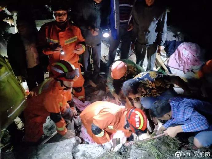 18日凌晨,宜宾消防救援支队联合当地群众在长宁县葡萄8组竹林口成功搜救出两名被地震埋压人员。(图片来源:宜宾消防)