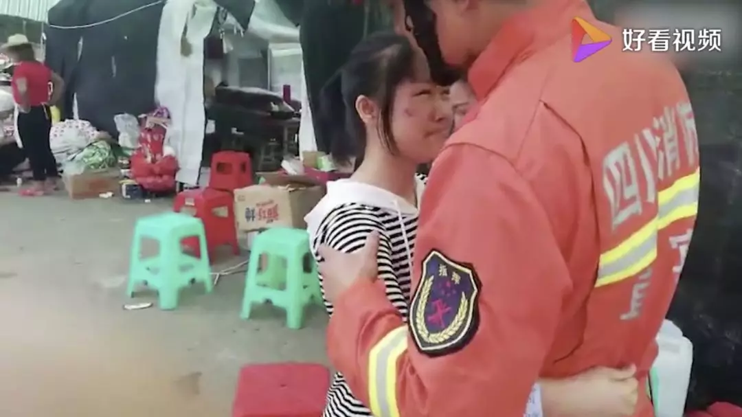 2019年6月20日下午,在四川省宜宾市长宁县双河镇中学安置点,一名女孩偶遇救她的消防员,她含泪拥抱感谢消防救援人员:你们一定要注意安全。
