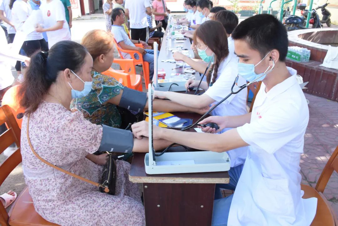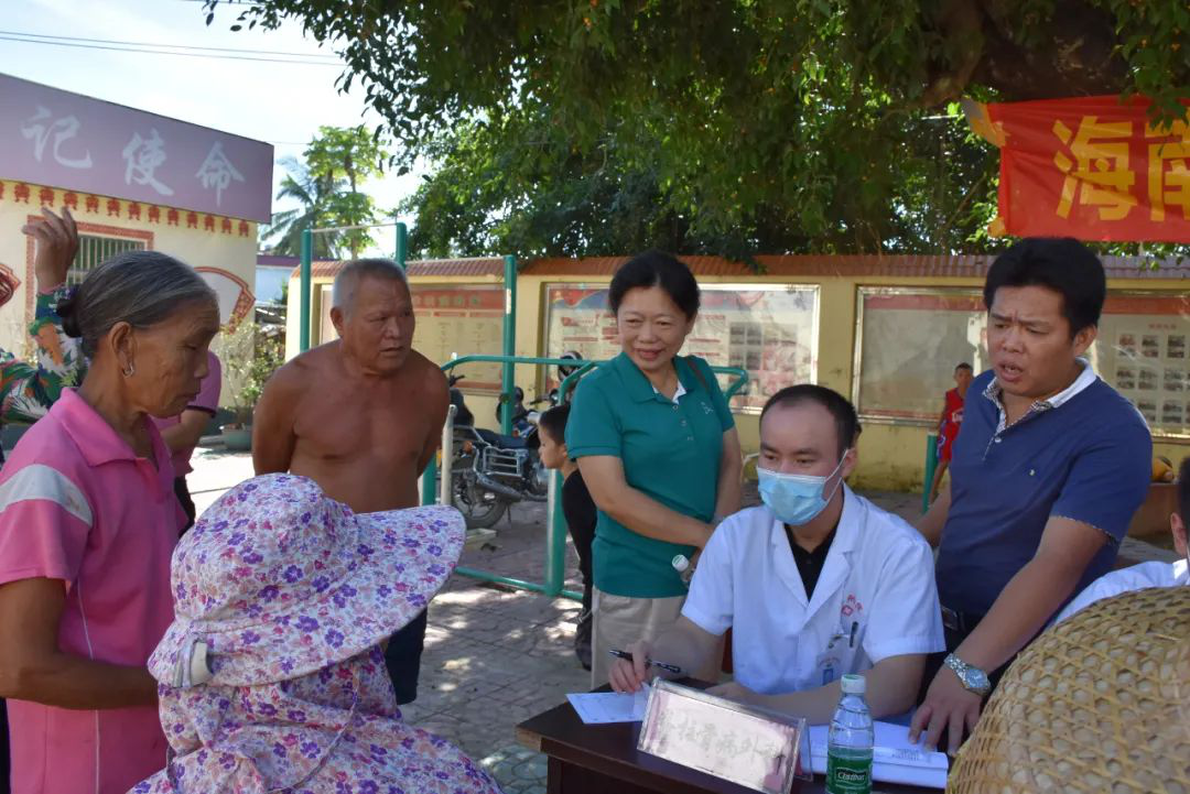早8时30分,医疗服务队在海南医学院热带医学与检验医学院副书记、番豆村驻村第一书记王基鸿的协助下,于村委会组织开展义诊赠药活动,海南医学院第一附属医院专家为村民提供专家面对面问诊、开方赠药。同时,团队的学生志愿者也在现场为村民测量血压、血糖,普及高血压健康相关知识。