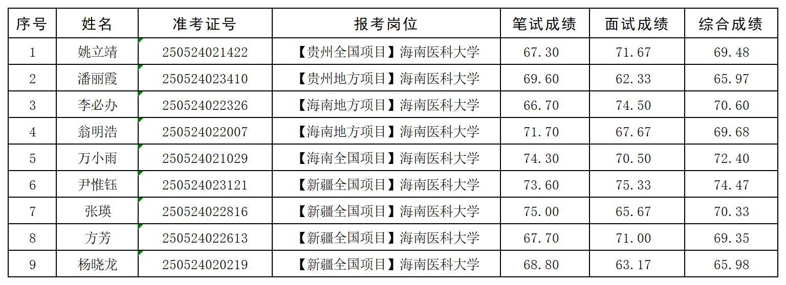 2025年海南省大学生志愿服务中西部计划招募面试工作已结束, 根据《2025年海南省大学生志愿服务中西部计划招募公告(第1号)》等要求,现将综合成绩及体检等有关事宜予以公告。