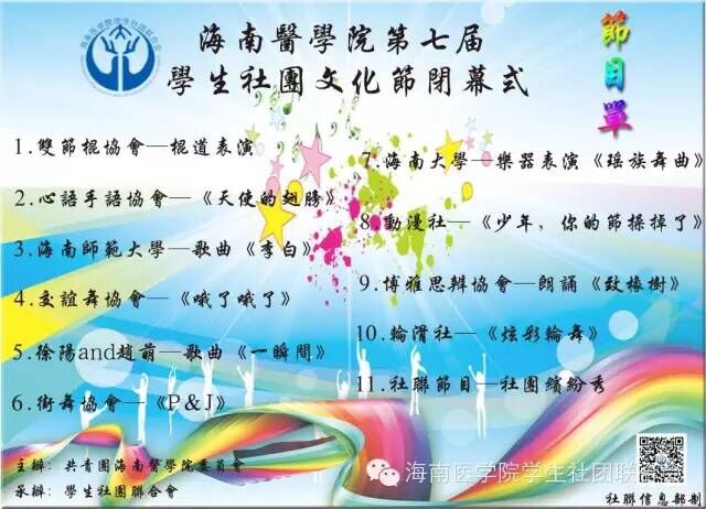 duang~duang~海南医学院第七届社团文化节于2015年6月6日在taptap点点圆满落幕,本次社团文化节自开幕直至闭幕共持续了一个多月。在此期间各社团使尽浑身解数,准备了各种各样的小活动和小奖品,让同学们在享受游戏的同时既了解了该社团又得到了有纪念意义的小礼物。今晚在风雨操场举办的闭幕式则更是将快乐最大化,为此次文化节画上一个精彩的句点。