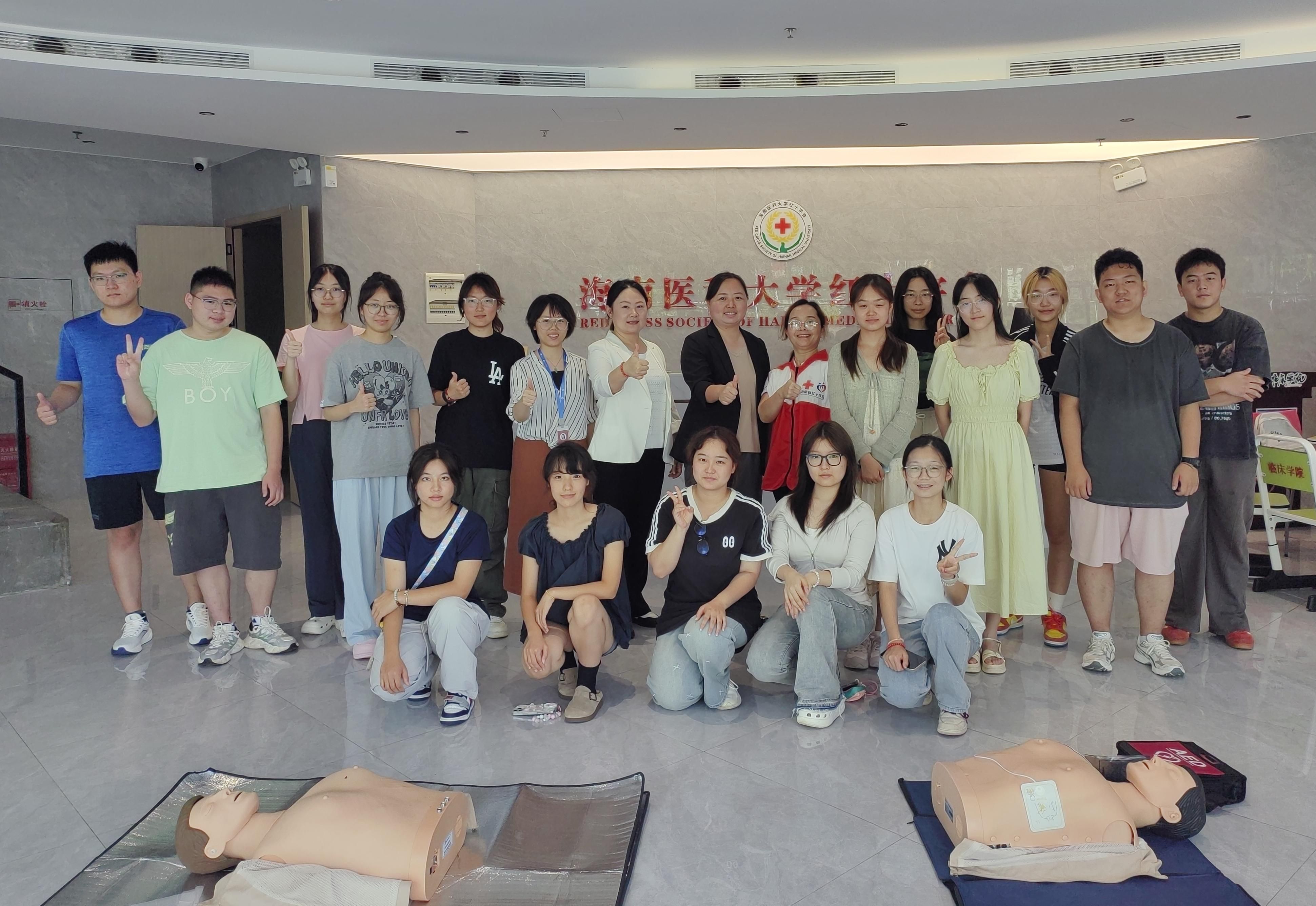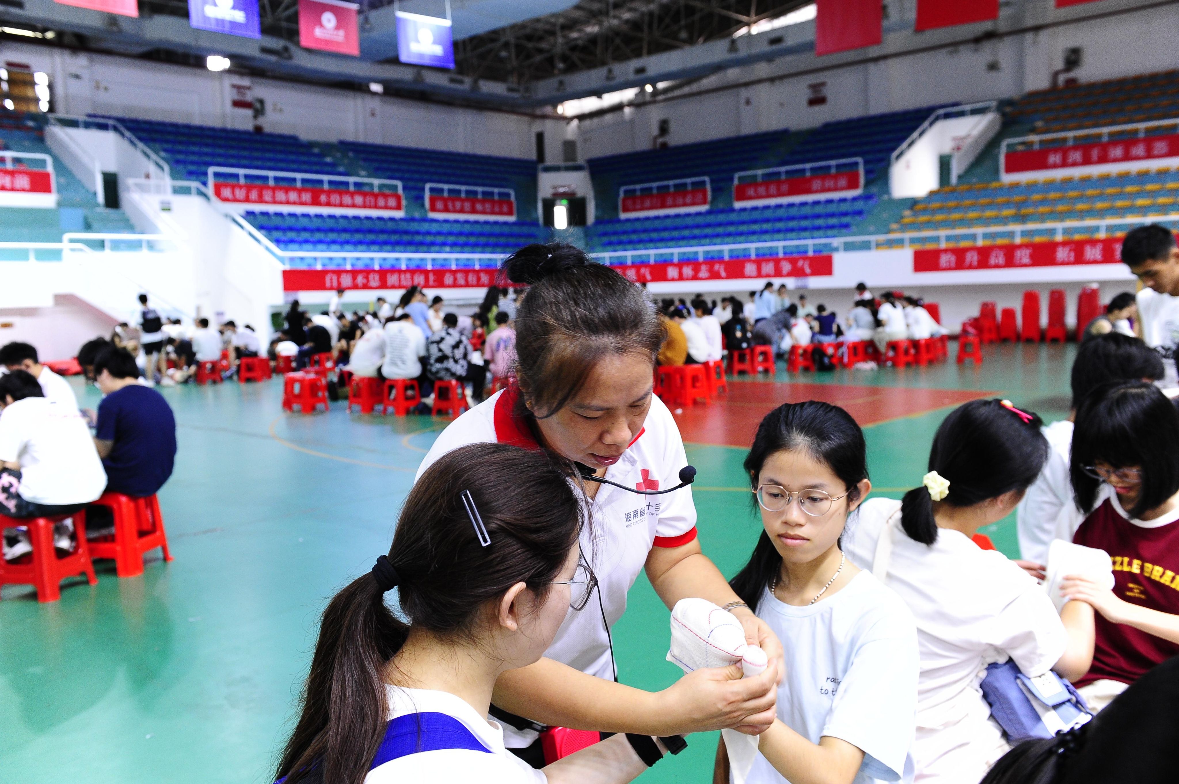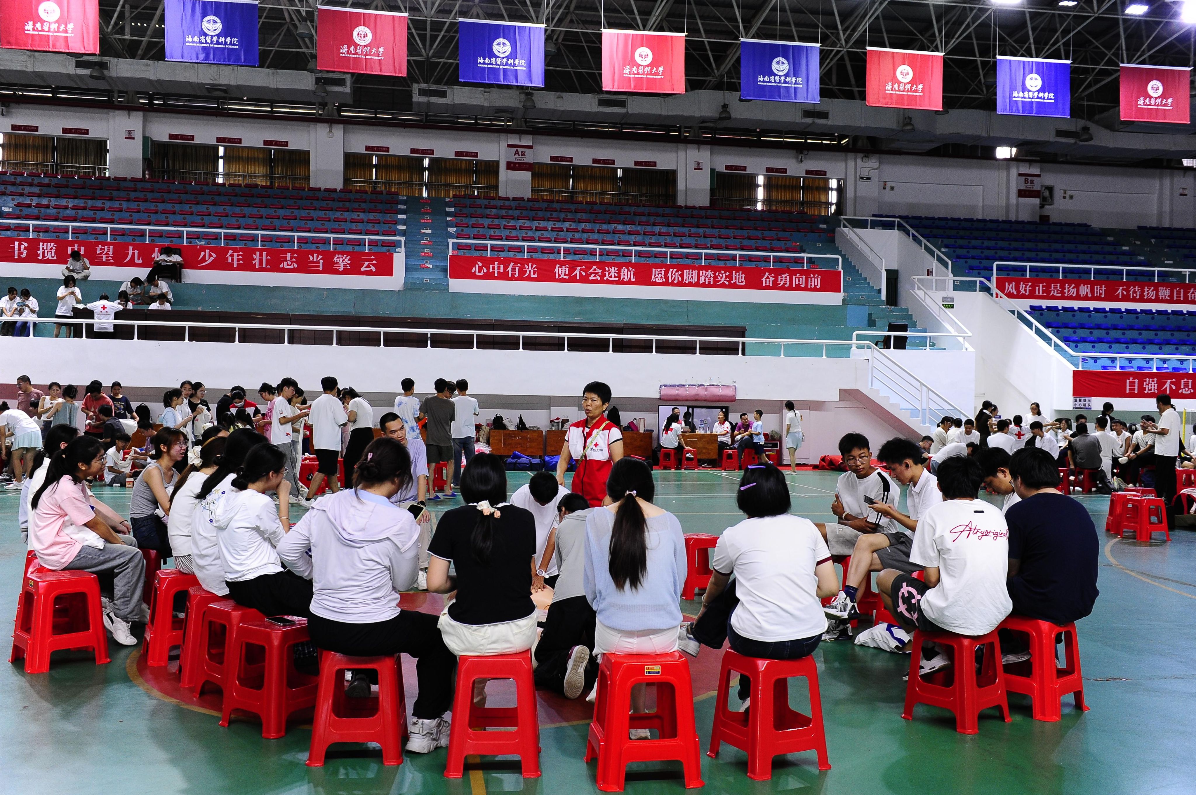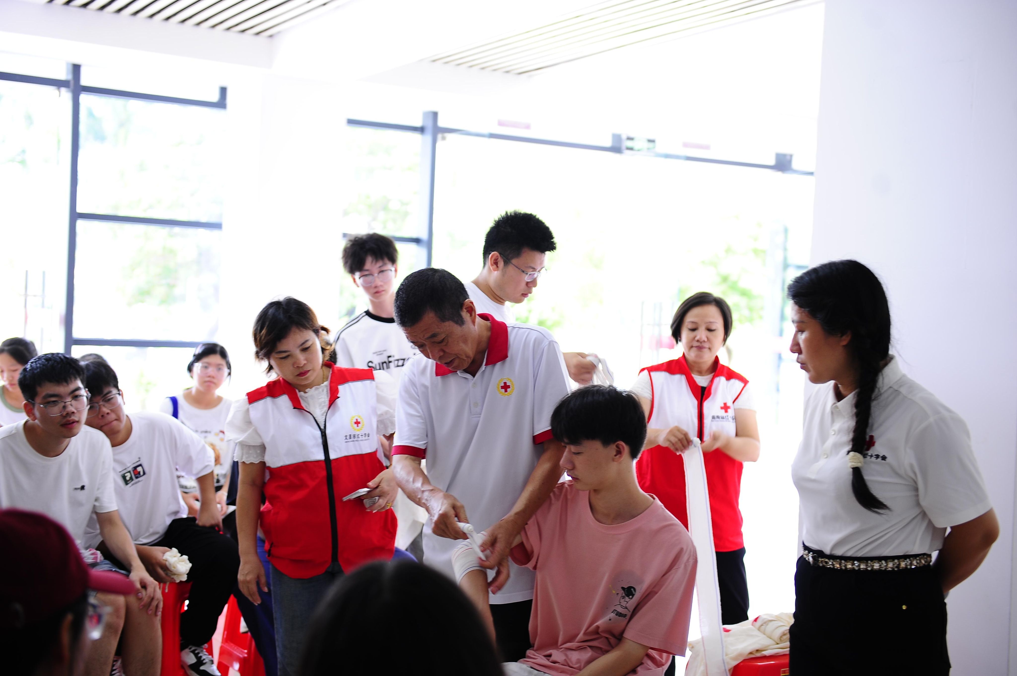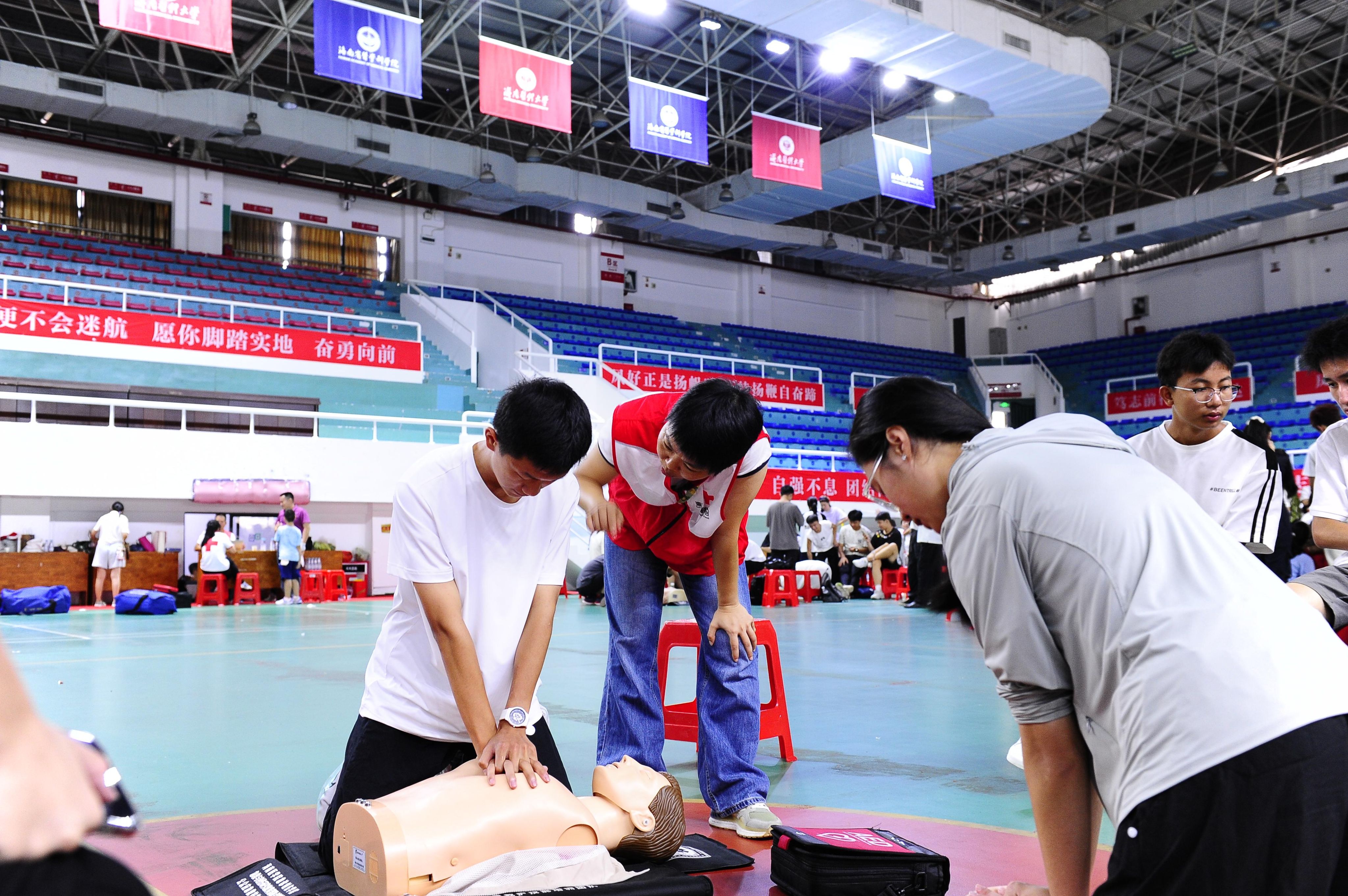 本次培训联合海南省红十字会组建专业教学团队,分批次覆盖全体2500余名新生。采用“小班化教学+一对一指导”模式,通过“理论学习+模拟实操+情景考核”三步教学法,重点学习心肺复苏(CPR)、AED使用、止血包扎、骨折固定等应急救护核心技能。考核合格者将获颁海南省红十字会《应急救护员证书》。