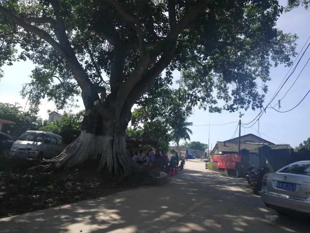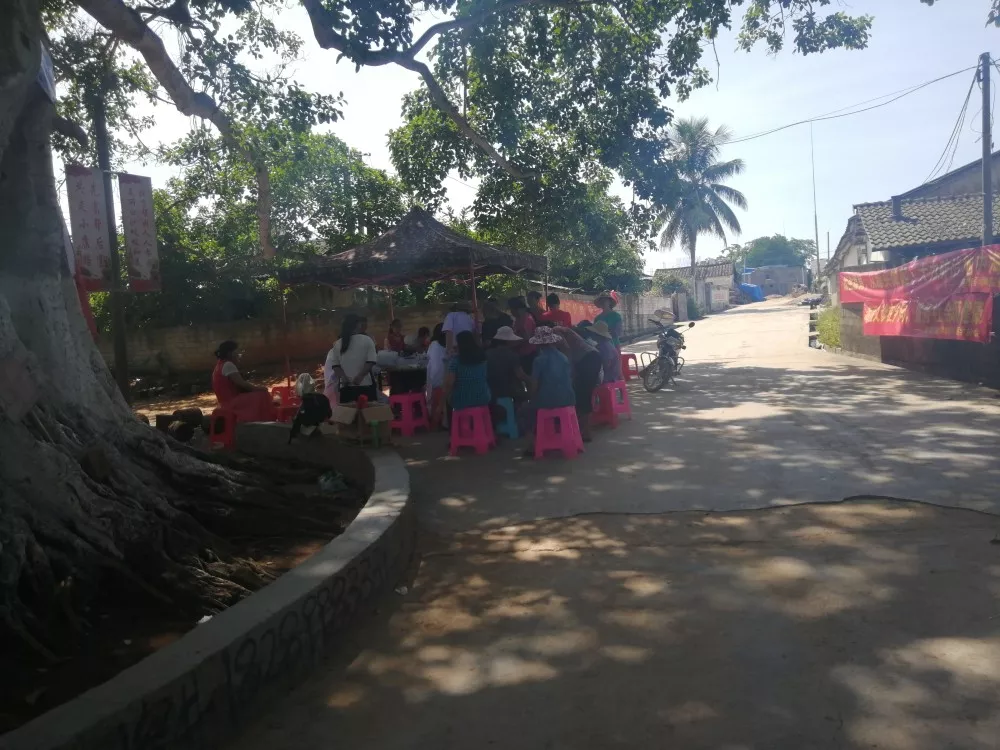 7月16日,是taptap点点地贫筛查和宣讲团队三下乡的第3天,这一天依然阳光热烈,万里无云。经过前一晚酷暑的虐待,我们依然早起,跟随镇团委符景英同志和芙蓉居居委会林南主任于上午八点来到了白沙县荣邦乡榕头村。榕头村,名字来源于其村头那棵寿命已经超过120岁的大榕树。而成员们今天早上的工作场地就在这棵百年大榕树的绿荫下。