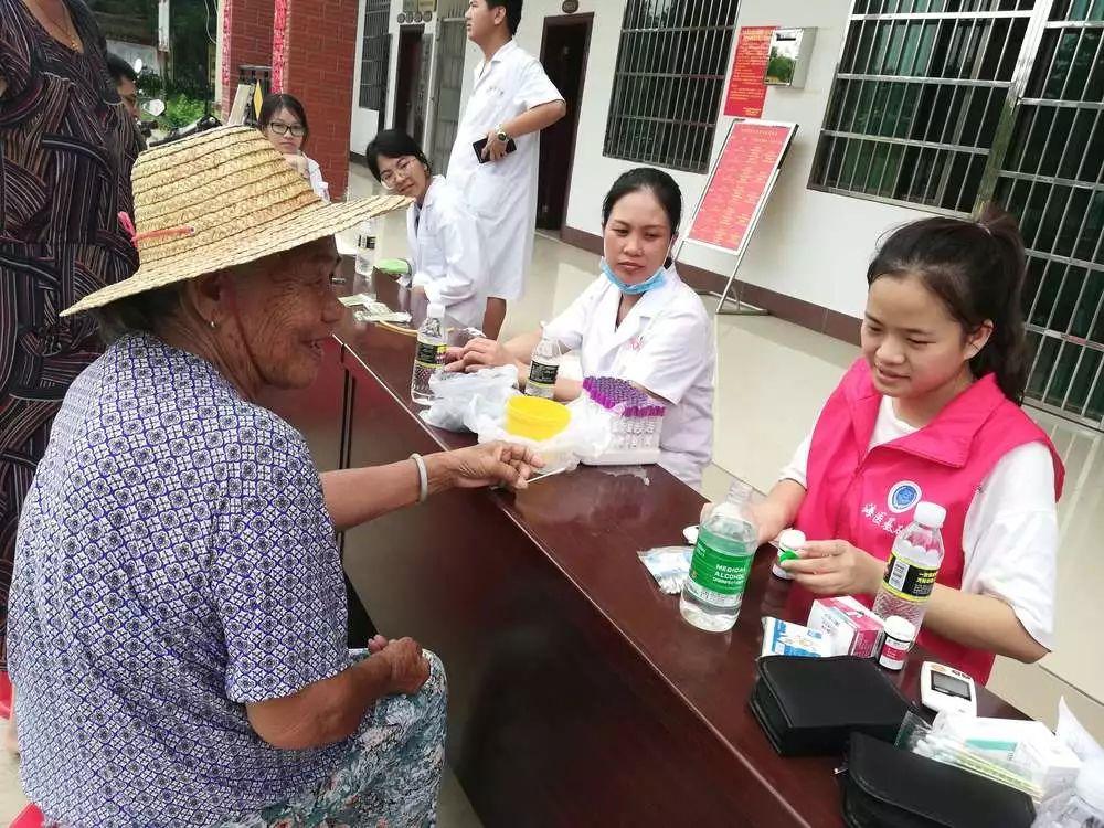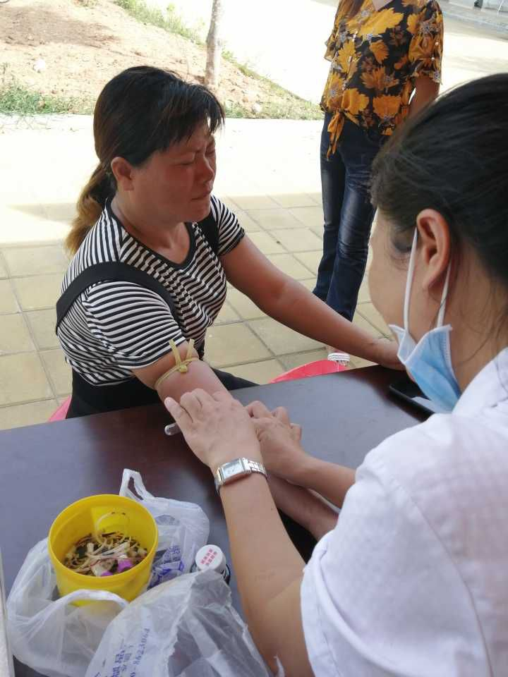 走了两三公里的路终于来到了俄郎村村委会办事处,经过简单的准备工作后,我们今天真正的工作开始了,我们分工明确,李昆宁同学负责组织村民排队并登记村民的各类信息,曾雪红同学负责负责量血压,羊淑爱同学负责测血糖,还有莫诗文,周丽肖,黄晓文同学,以及我们的带队老师劳梅丽老师共同参与地贫相关知识的宣讲以及问卷调查。还有吴柳妃护士帮助我们抽血采样。工作有条不紊的进行着,可能是因为我们工作的时间与村民们的收胶水的时间冲突了,所以青壮年人来的比较少,一般都是老年人过来,无论人多人少我们都会认真的向每一个人宣讲关于地贫的相关知识,并且嘱咐他们多多向身边的人宣传这个知识,让更多的人明白如何预防这个疾病。据我我观察,好多人都很害怕被扎针抽血,更害怕我们是什么骗子团伙,但是在我们向他们讲清楚来历后,为了自己以及家人的健康,为了安心,一般会选择克服内心的恐惧,给我们抽血筛查地贫基因。最令我们敬佩的是一个小男孩,在妈妈的带领下,来到我们面前登记完信息后拿着编好号码的血管自己来到护士面前抽血(当时他妈妈在另外一边测血压)护士给他搽酒精的时候我们的内心都是绷着一根弦的,都觉得针头扎下去的那一刻他会哭出来,事实证明是我们低估他了,他真的很勇敢,甚至可以说是内心毫无波澜。这实在是令人敬佩。