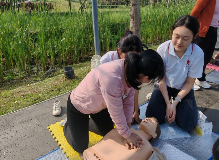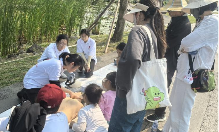 依托医学院校专业优势,志愿者团队围绕“全生命周期健康”理念,开展多元化服务:设立健康咨询台,为市民提供血压监测、慢性病防治指导;通过急救技能培训与AED设备操作演示,提升公众应急救护能力;针对海南热带气候特点,科普登革热防控知识,织密公共卫生防护网。青年党员先锋队更是以“沉浸式教学”与市民互动,将急救知识转化为实践技能,展现自贸港医学青年的专业素养。