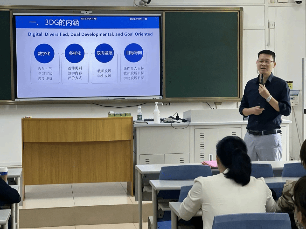 刘忠喜教授介绍了“3DG”的内涵,即“Digital”(数字化), “Diversified”(多样化), “Dual Development”(双向发展)及“Goal Oriented”(目标导向)。上述理念有机地融合在教学内容、学习方式、评价方式和教学发展目标等多个教改涉及的层面。此外,刘教授还基于外语部近期在大学英语教学大纲上的新改革,为老师们呈现了基于3DG理念的大学外语教学在教学任务,翻转课堂设计等方面的改革实践探索,并搭建了也为外语部教师提供新的教学优化方向,助力金课设计。