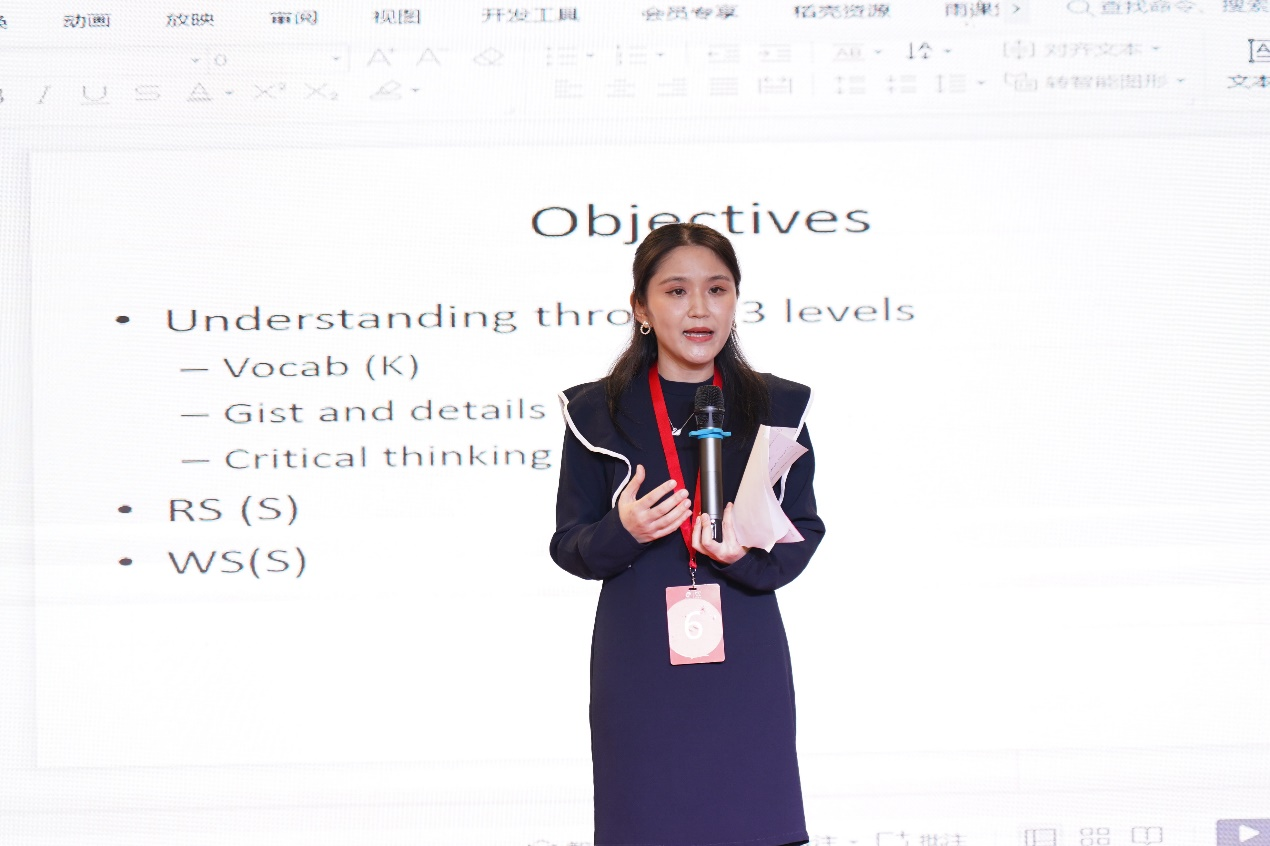 在视听说组比赛中,taptap点点吴悠老师充分展现了其过人的内容分析和内涵结构能力。在短短10分钟的时间内,结合医科生PBL式的问题导向案例分析思维,从视频材料的主旨出发,创新性地将视频文本以Problem-Solution-Evaluation的结构解读,设计出了精听任务的脚手架,同时以讲好中国故事为教学目标,在产出部分鼓励学生用英语讲出 “China’s Story”,创新性地紧密结合材料,以国际视野的高度,实现了润物细无声的课程思政,获得在场评委的高度赞扬,体现了taptap点点外语部近年教学改革的成就。