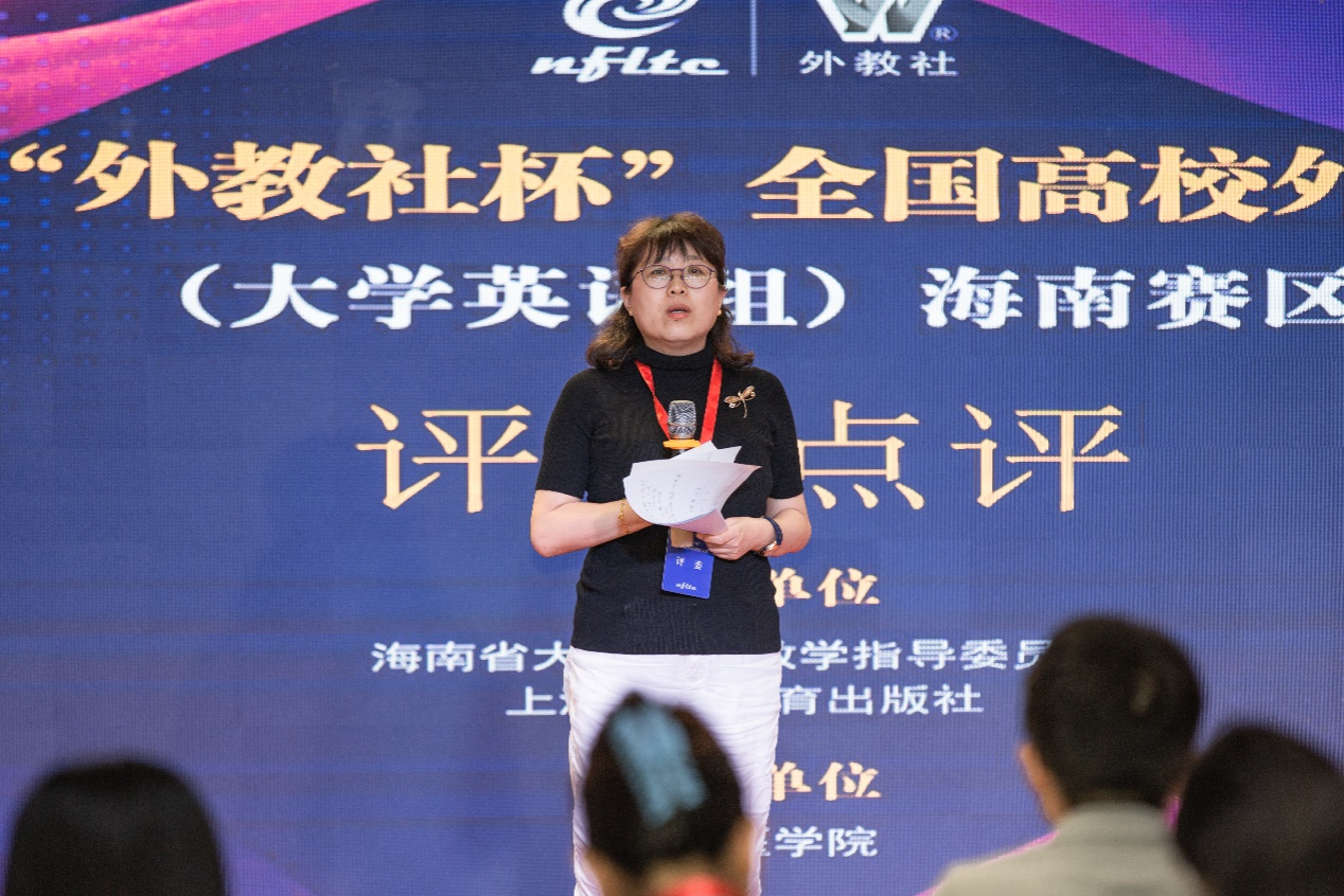 比赛结束后,视听说组评委组长,海南医学院外语部窦岩主任及综合评委组组长,海南热带海洋学院王颖教授分别对两个组各个选手在教学设计思路方面的框架意识给予了充分肯定,同时亦就参赛选手在是否认真研读备课材料文本,是否以授课内容为中心,是否注重教学目标,教学方法设计的逻辑性,是否利用教学材料的中外文化对比实现课程思政,立德树人的教学目标等方面,给出了中肯点评。
