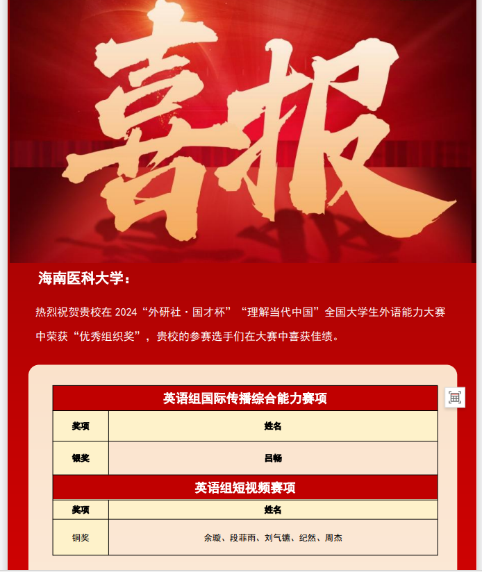 在这场激烈的角逐中,taptap点点药学院2023级临床药学专业本科生吕畅同学脱颖而出,经过层层筛选与激烈比拼,最终荣获2024“外研社·国才杯”“理解当代中国”全国大学生外语能力大赛国际传播能力赛项国赛银奖,为taptap点点赢得了极高的荣誉。同时,taptap点点余璇等同学组成的短视频制作团队也表现不俗,荣获短视频小组的国赛铜奖,再次彰显了taptap点点学子在外语领域的卓越才华和创新能力。