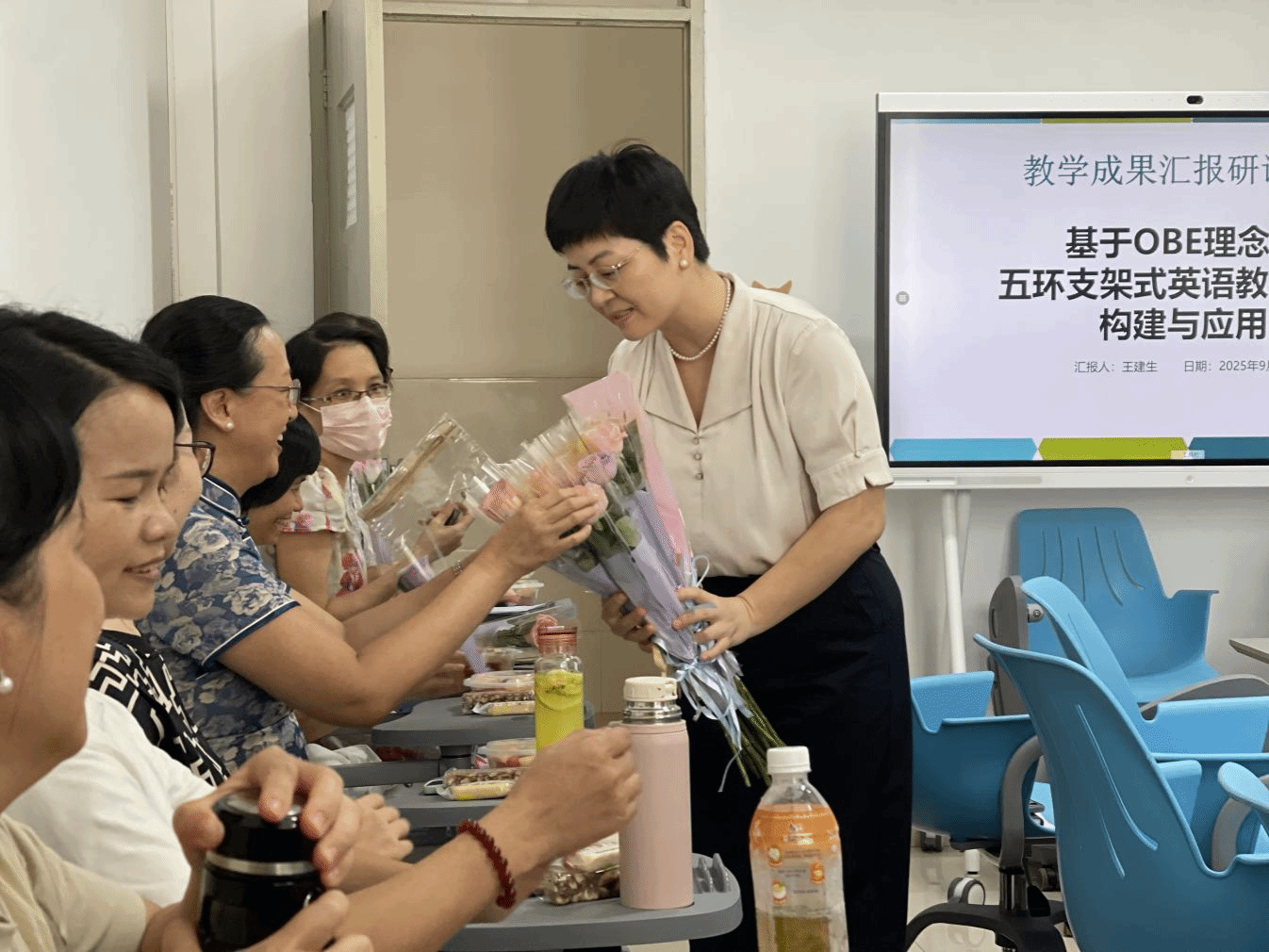 会议伊始,李丹云副主任转达学校党委对全体教师在第41个教师节到来之际的亲切问候,并向每位教师送上校党委准备的鲜花。