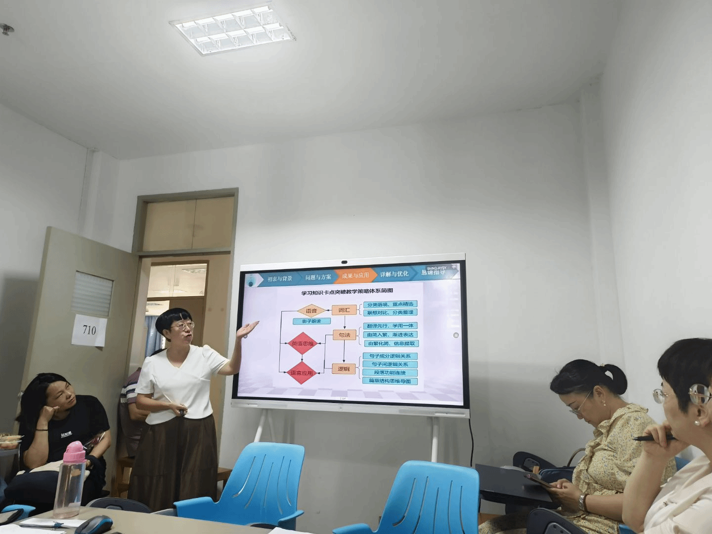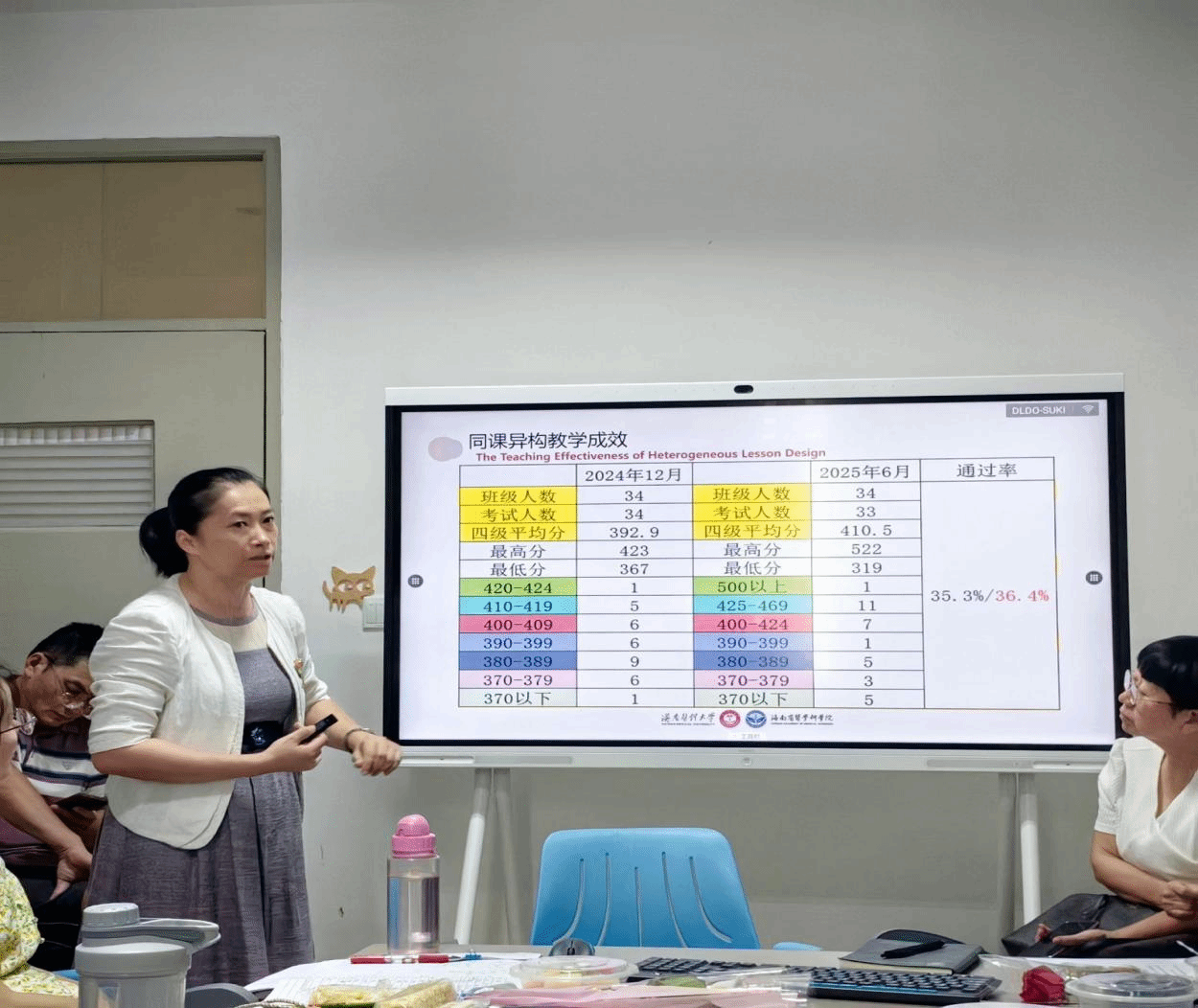 随后,王建生副教授开始分享基于OBE理念的“五环支架式”英语教学体系的构建与实际应用,为外语部推进大学英语四级教学改革提供了重要理论支撑与实践路径。紧接着,曾美婷老师以“24本48班大学英语2”为例,详细介绍了英语四级同课异构的教学设计与宝贵经验。刘佳老师围绕B/B+班课堂教学管理,分享了分层教学过程中的具体策略与显著成效,倾注了对学生个体的温情关爱。林娜老师也结合不同专业与班级的学风特点,交流了四级班教学管理中采取的针对性措施。卜海英老师聚焦大学英语四级听力与阅读教学难点问题,分别从听音辨词技巧、长难句理解和段落结构分析等方面作了实用而细致的教学分享。